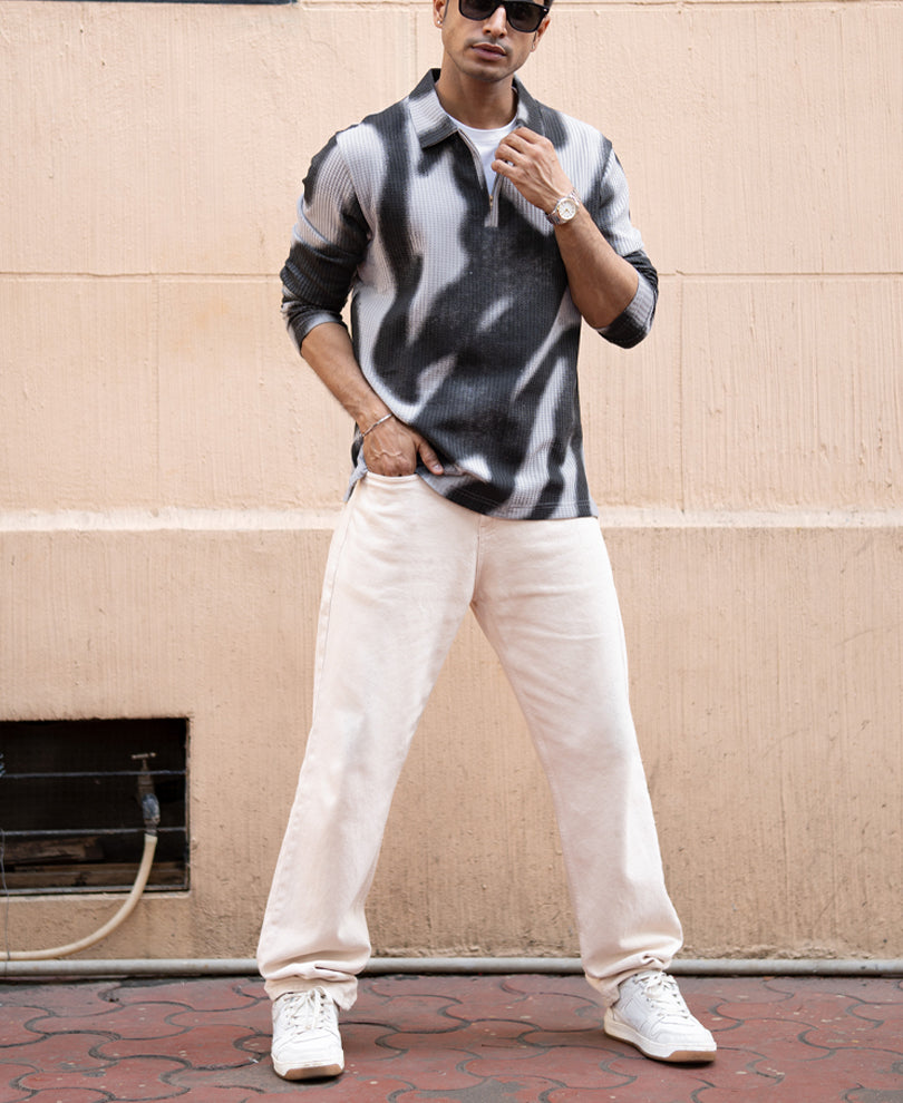 A bold monochrome statement in motion. Featuring a textured surface and abstract print, this grey structured tee redefines casualwear with an artistic edge. Soft, breathable, and striking from every angle