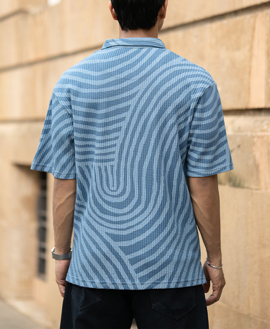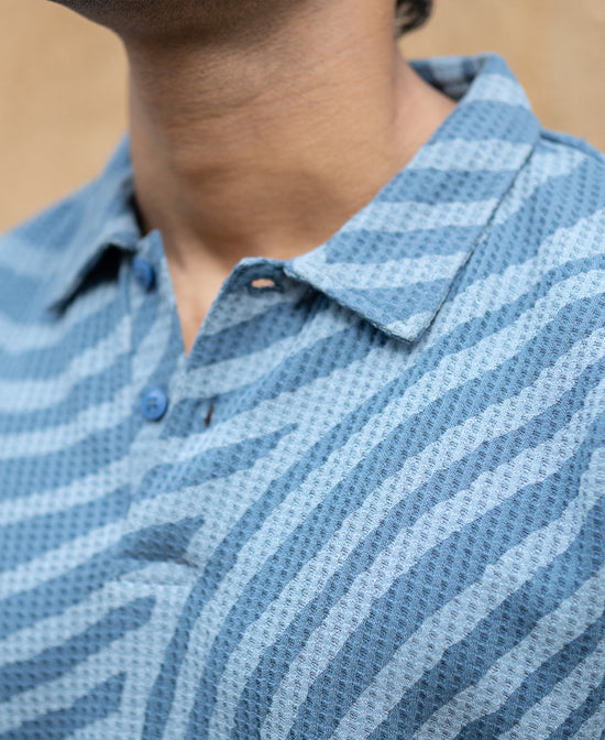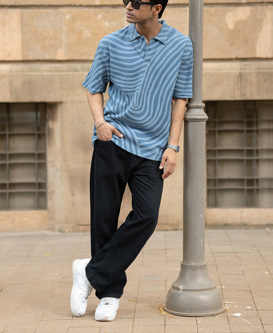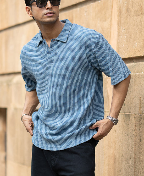 Visual depth meets laidback dressing. This collared zipper tee features subtle curved stripes in sky grey and deep blue tones, adding a 3D feel to your everyday rotation. Breathable and textured, this is your not-so-basic basic. Works best with solid shorts or loose-fit trousers. Chill, but considered.