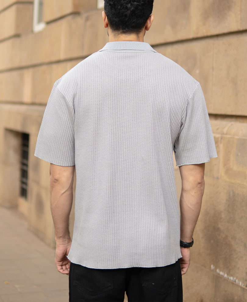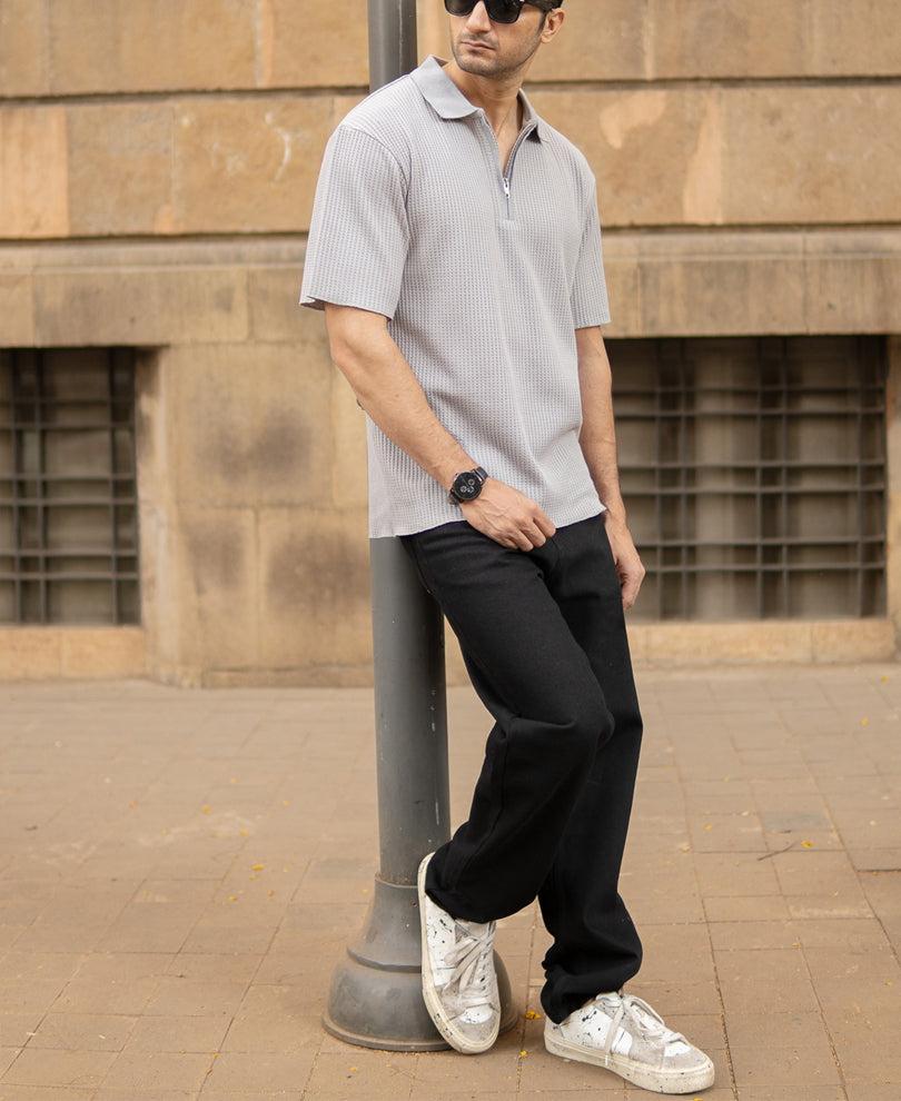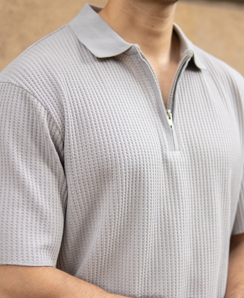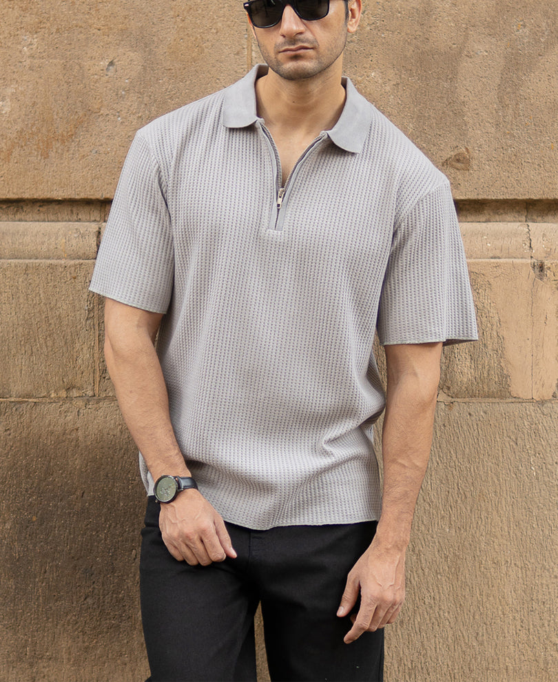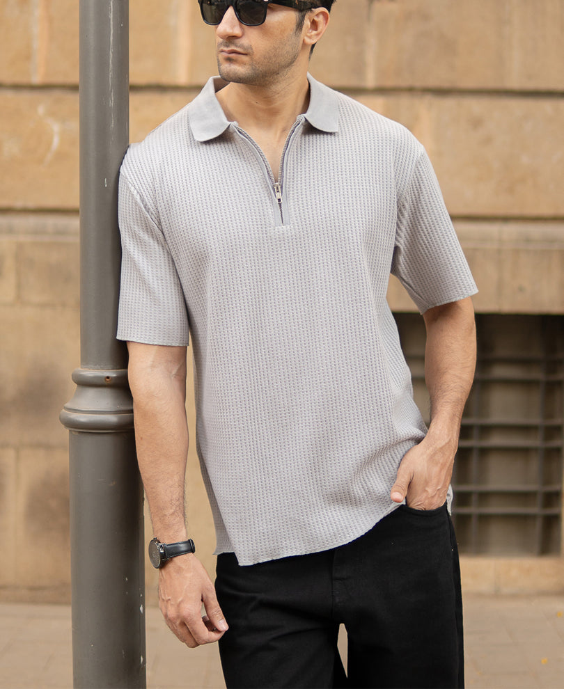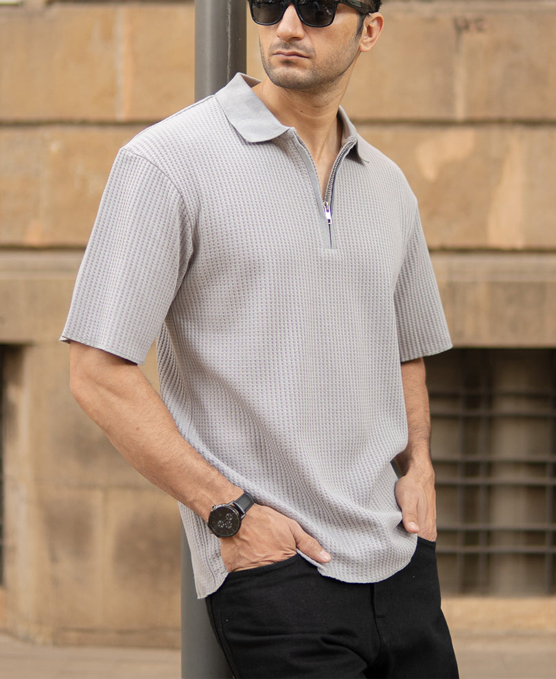 The Grey Structured Zipper Polo T-Shirt is all about clean lines and subtle textures, apt for minimal looks and maximum impacts.. Crafted from a breathable structured knit and finished with a sleek half-zip closure, this piece nails the balance between casual and elevated. Wear it zipped up for a sharper vibe or open for an easygoing look. Pairs effortlessly with black denim or relaxed chinos.