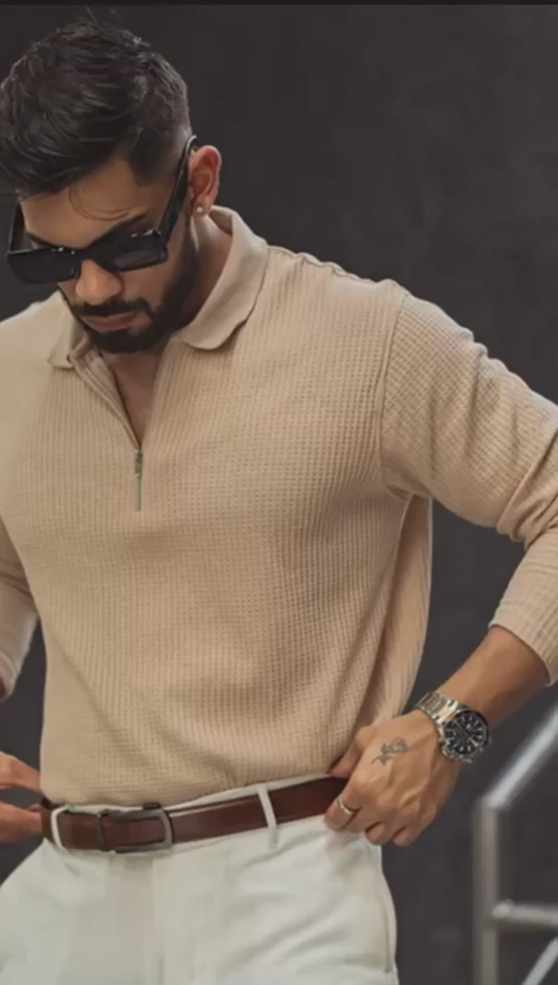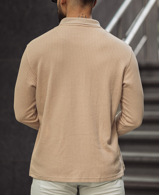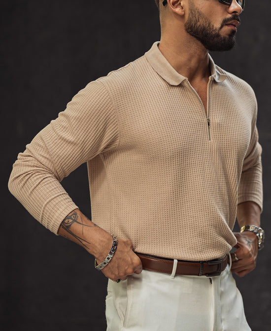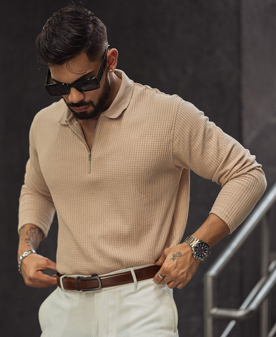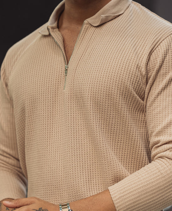 Light Fawn Waffle Design Regular Fit Full Sleeve T Shirt with Zipper