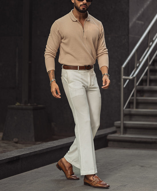 This Light Fawn Waffle Design T-Shirt features a textured waffle knit, full sleeves, and a sleek half-zip front that balances comfort with refined style. The regular fit makes it versatile for layering or wearing on its own, perfect for effortless smart-casual looks.