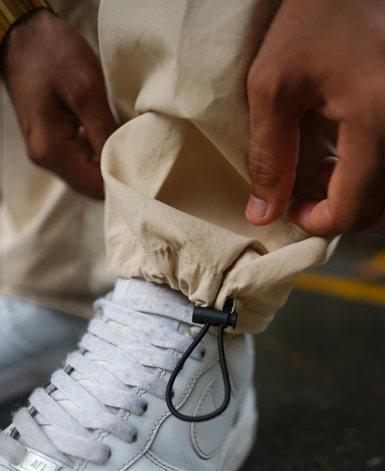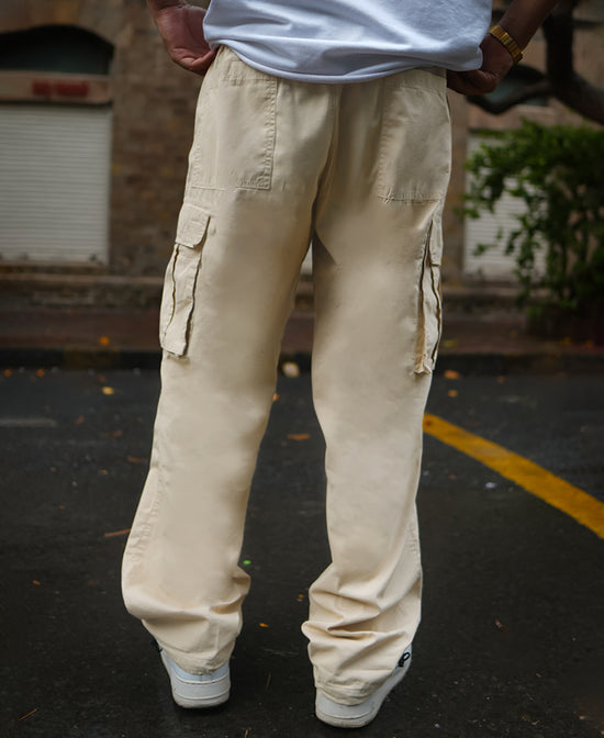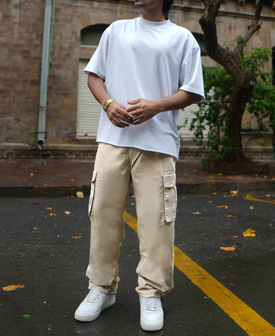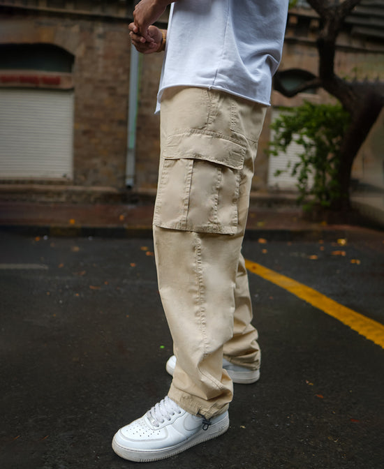 Want bottoms that offer both utility and style? Get our light beige baggy-fit parachute pants for men, crafted from tough yet comfortable fabric. The relaxed fit and ample side pockets make them perfect for everything from weekend errands to casual outings. Throw on a tee and sneakers for a laid-back look or switch to a button-down shirt for a more refined ensemble.