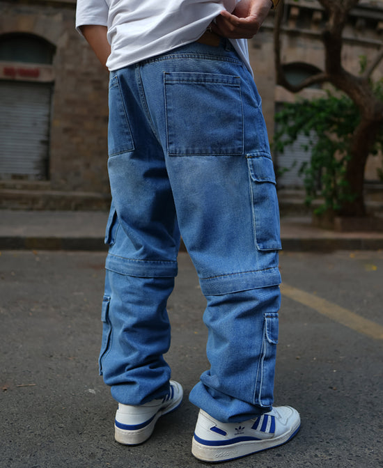 Get twice the wardrobe upgrade with our light blue baggy jeans for men, featuring a jeans + shorts design for versatility, premium denim for comfort and durability, and spacious pockets for utility. The baggy jeans will fly with your entire casual wardrobe, so style it however you choose to.