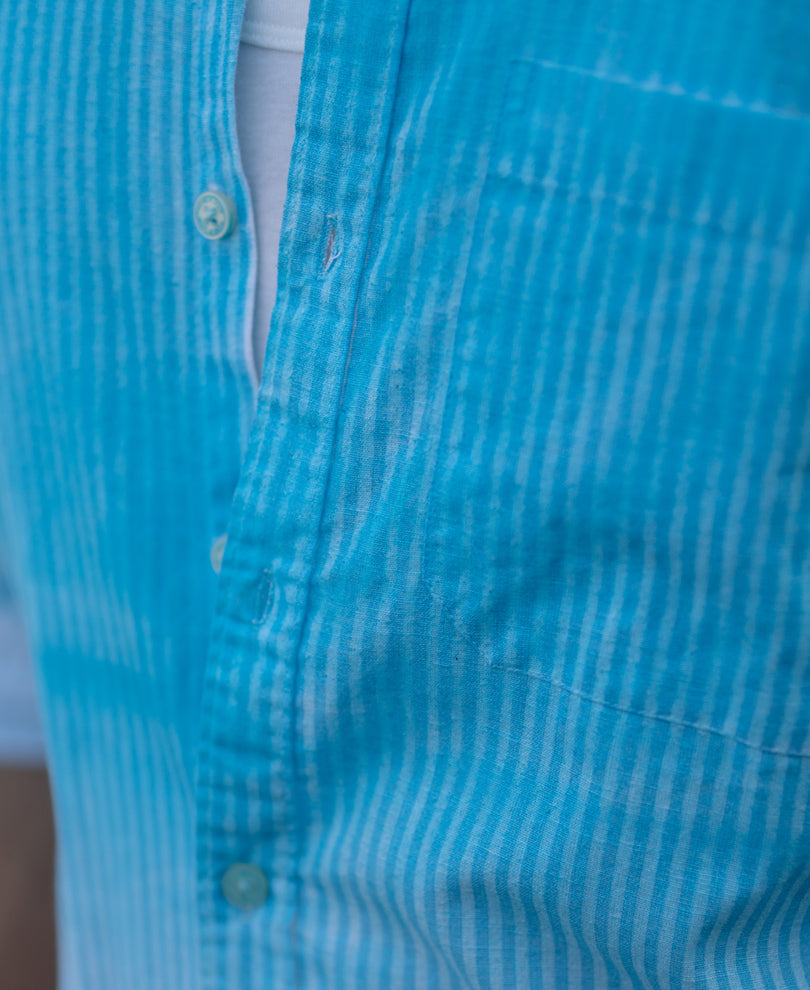 A refreshing play on tone and texture. This shirt features a soft gradient spray effect in calming shades of blue, blending casual ease with contemporary flair. Lightweight and versatile, it’s designed for those who like their classics with a touch of personality.