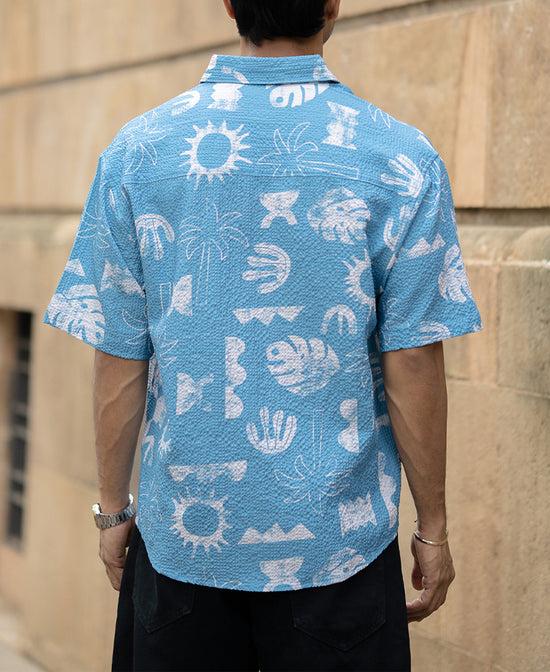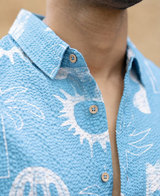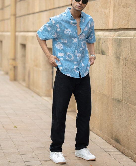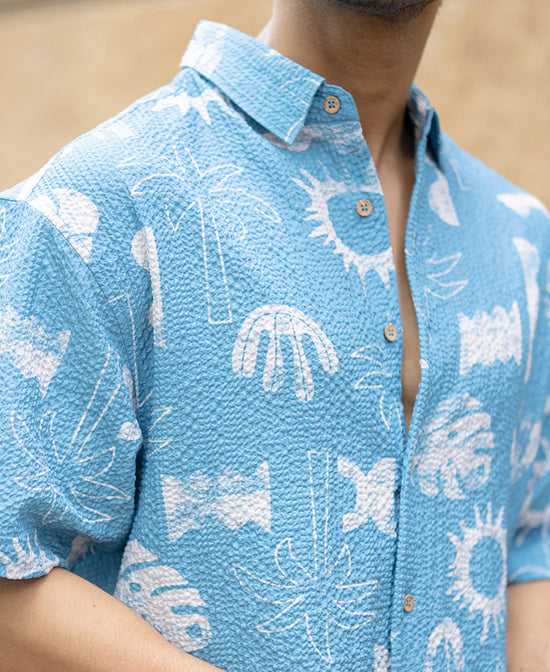 A chill, beach-ready piece with a fun twist. This light blue shirt features playful tropical motifs in a breezy textured finish. It's vacation in a shirt - easygoing, eye-catching, and made for sun-drenched getaways or weekend brunches. Pair it with whites to set the perfect vibes