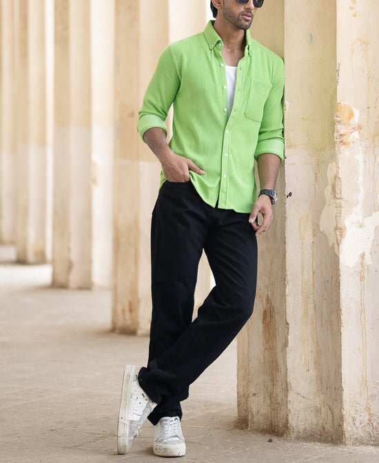 Fresh, sharp, and impossible to ignore. This lime green full-sleeves shirt brings a bold twist to your wardrobe. With a clean fit and smooth fabric, it’s built for guys who don’t mind standing out—whether at a brunch or a casual office day.