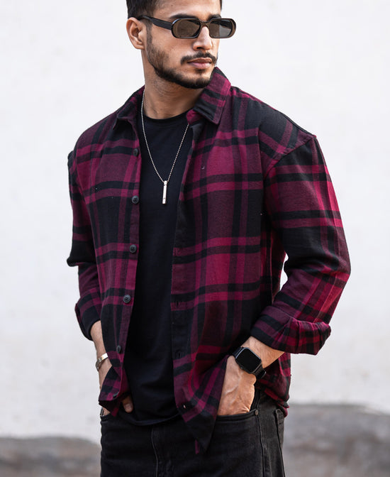 Maroon Plaid Checks Oversize Drop Shoulder Shirt