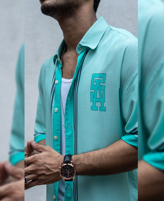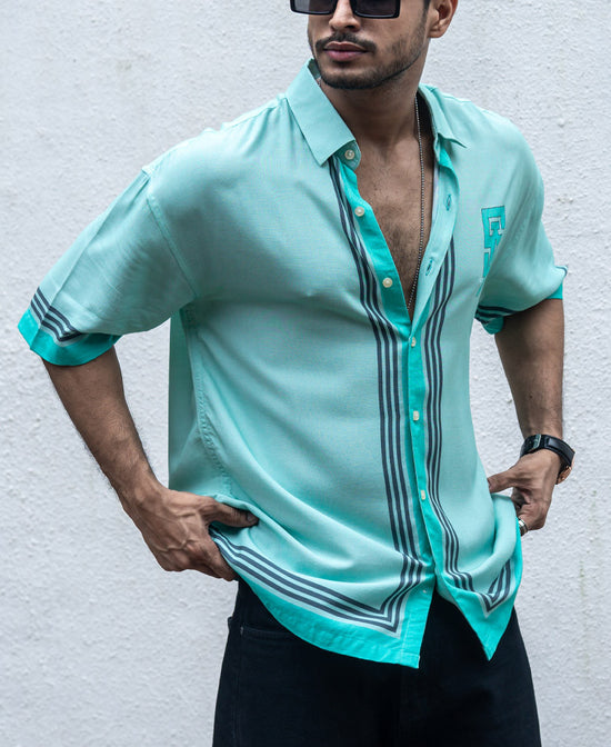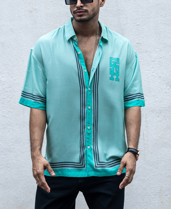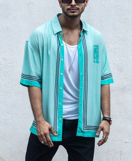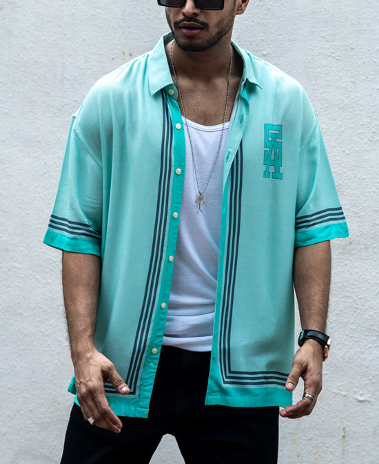 Refresh your wardrobe with the mint green oversized shirts for men featuring a spread collar, half sleeves, drop shoulders, chest print, and cross-border detailing. Crafted from cotton viscose-rayon fabric, the oversized shirt guarantees comfort for extended wear. Wear it with jeans or relaxed trousers for a distinct statement look.