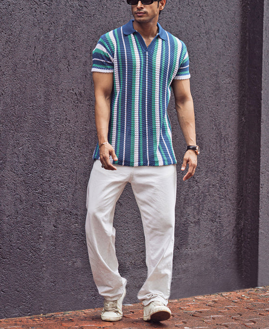Kick it old school with our multicolor knitted striped t-shirts for men, a throwback piece crafted from a breathable fabric, featuring bold, colorful stripes that scream bohemian vibes. Perfect for beach days or chill hangouts, this polo t-shirt keeps you comfy and stylish. Pair it with shorts or jeans for that effortless cool look.