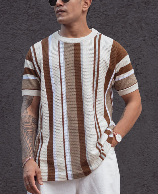 Brighten up your wardrobe with this multicolor striped T-shirt, featuring a playful crochet design. Perfect for adding a dash of color to your smart-casual looks, the round neck and half sleeves keep things effortlessly cool while the structured fit ensure