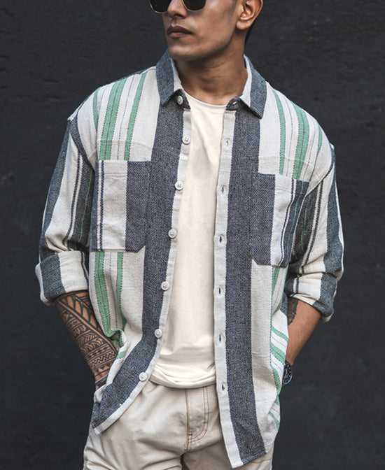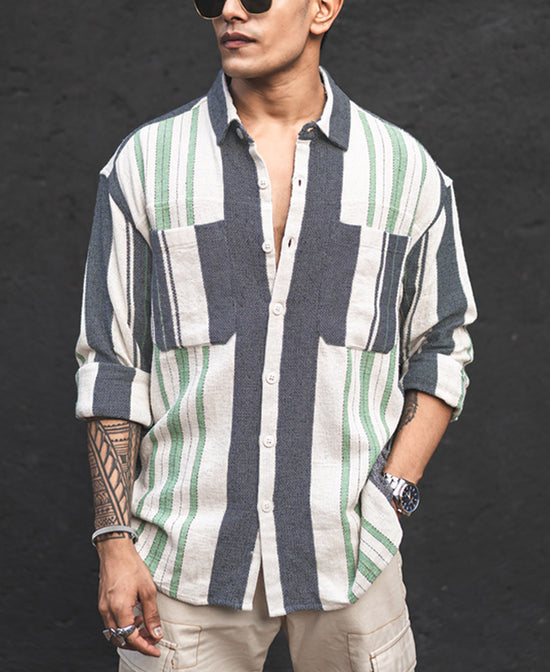 Get a shirt + layer in one with our multicolor striped oversized shirts for men, featuring a spread collar, double chest pockets, drop shoulders, and full sleeves. Made of a premium Structured Blend fabric, the striped shirt keeps you comfortable all day, no matter the setting. Wear it with jeans or trousers to dress up or down for any outing.