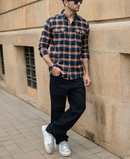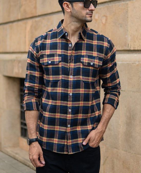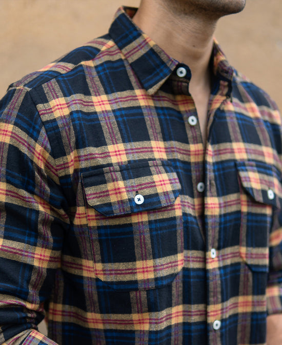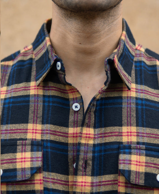 This multicoloured check shirt brings back heritage vibes with a laid-back twist. Classic, Rebellious - The double chest pockets add workwear attitude, while the saturated colors keep it far from basic. Flannel feel without the bulk—wear it to brunch or the dive bar, it works on both ends.