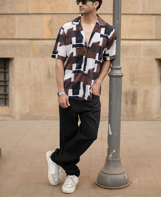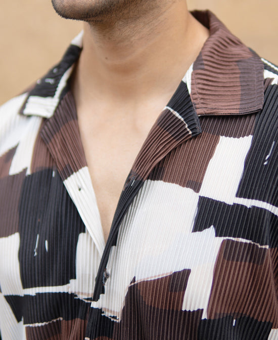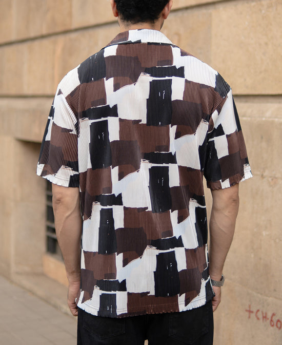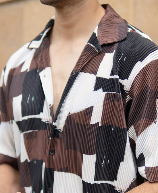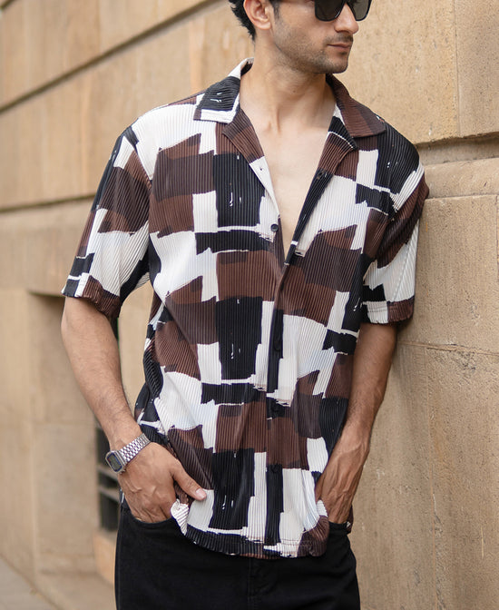 A shirt that looks like modern art on soft pleated fabric. This one's for days when you want your outfit to do the talking. Bold, breathable, and boxy; pair it with minimal trousers and let the print take the spotlight.