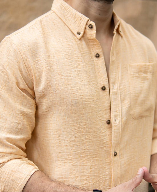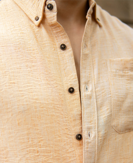 Understated, but never unnoticed. This shirt brings a raw, earthy feel with its slub texture and washed mustard tone. The fit is relaxed but still neat—ideal for dressing up with ease. Roll up the sleeves and pair with black or navy for a sharp payoff.