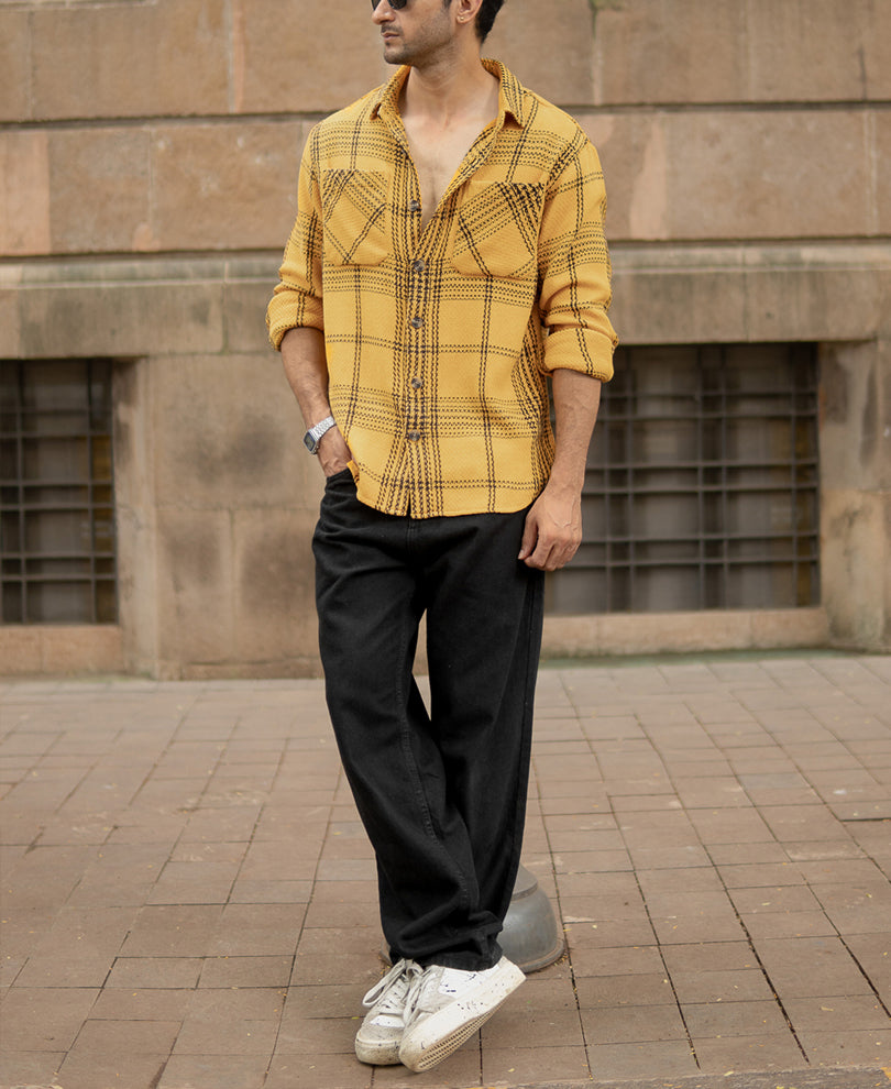 Warm, bold, and built to stand out. This mustard check shirt carries an autumn-ready charm. Its structured weave and classic check pattern give it texture and confidence, making it your perfect weekend statement piece. It makes you feel just like a beaming sunlight in this fall season.