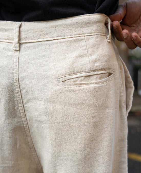 Crafted from a rich linen blend, these trousers redefine casual ease. The natural tone and textured weave lend it a timeless appeal, while the relaxed fit and drawstring waist keep it effortlessly modern. Pair it with shirts or polos. The structured drape of these pants complements everything with quiet confidence.