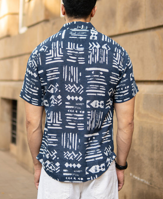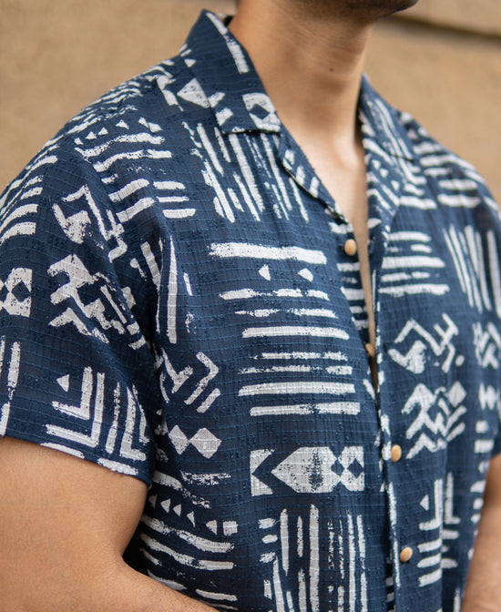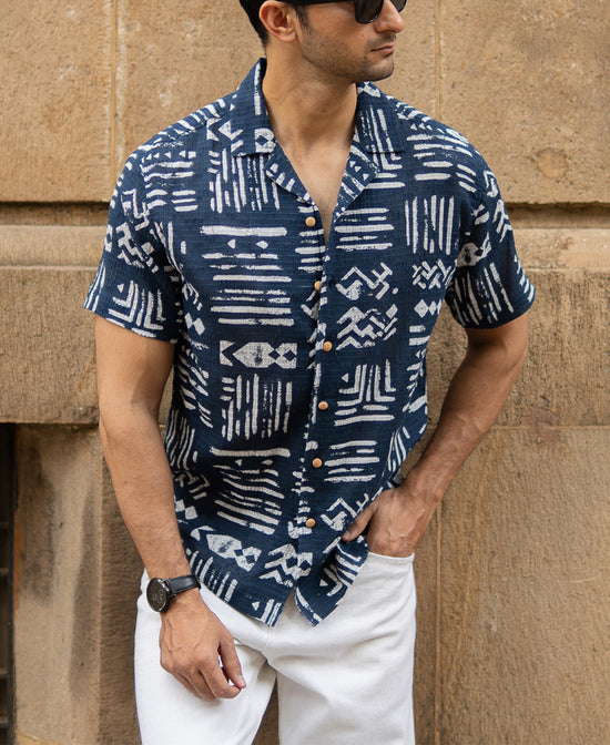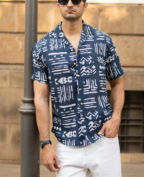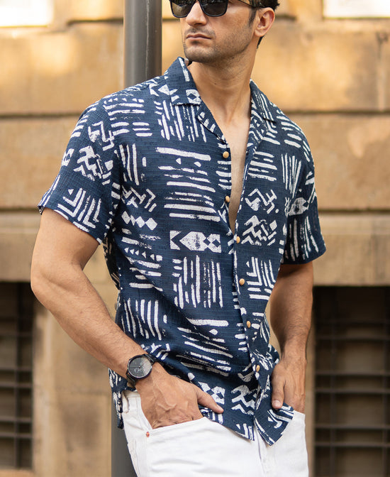 Patterns with purpose. The Navy Abstract Aztec Print Shirt is for those who like their classics with a twist. Bold without being loud, this shirt balances rich navy tones with tribal-inspired geometry. Ideal for days when your fit needs to say “I’ve arrived,†even before you speak.