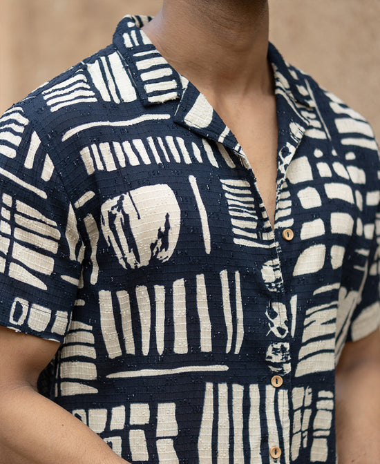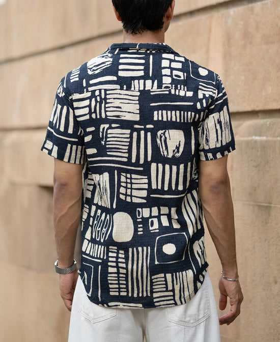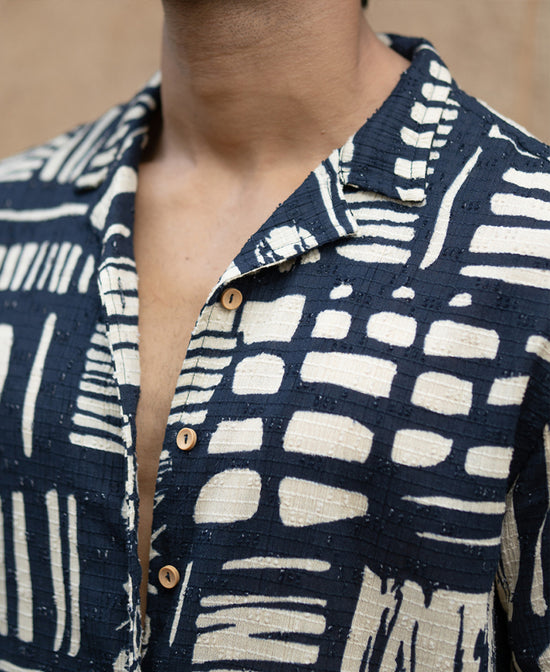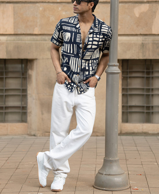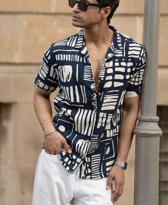 A navy shirt with artistic ambition. This one features abstract shapes that give it a contemporary edge, without overwhelming the look. With its structured fit and breathable fabric, it’s a modern conversation starter. Throw it on for date night, gallery visits, or just when you want your outfit to have a bit of a backstory.