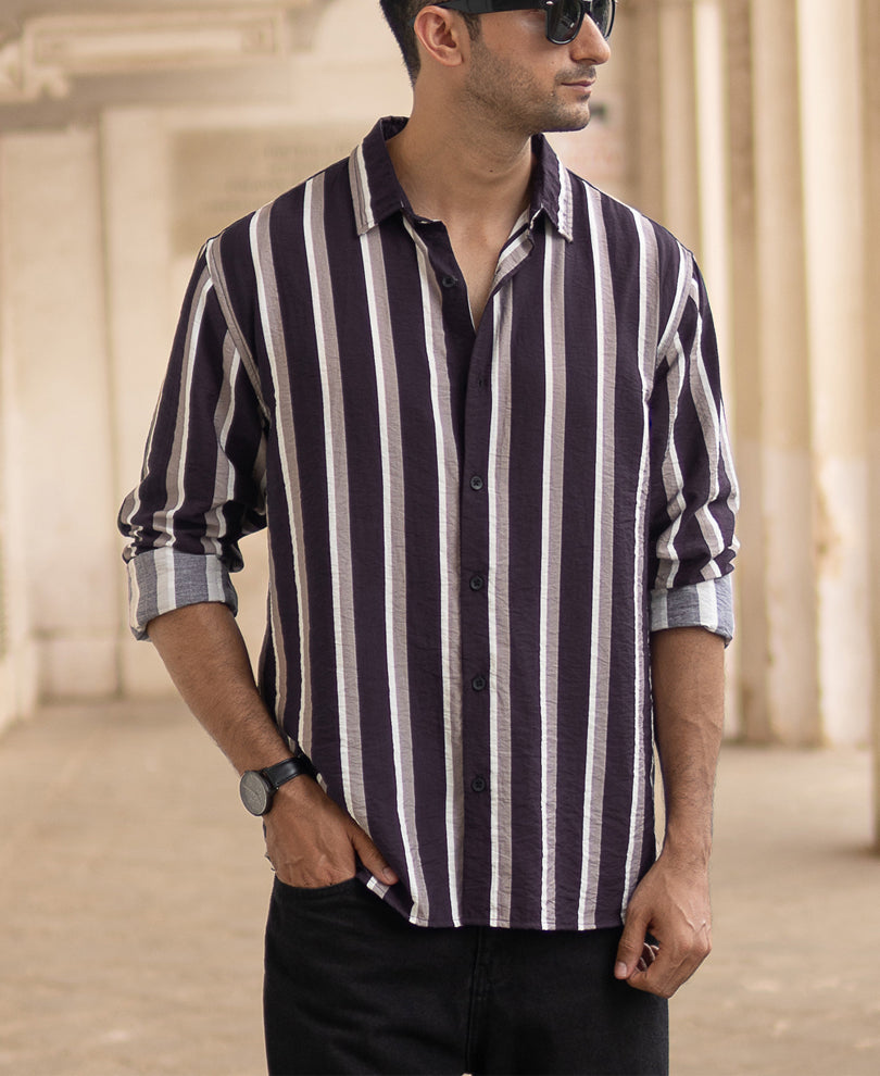 This navy and grey striped shirt keeps things linear in the best way. It’s got a refined pattern that feels thoughtful but never stiff. Roll the sleeves, wear it loose, layer it open; it’s built for movement and designed to keep your look locked without looking like you tried too hard.