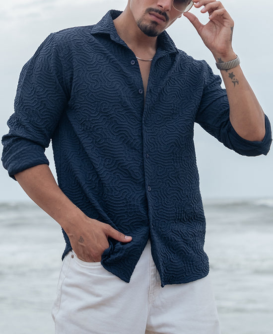 Need a shirt that can transition from day to night? Our navy structured full sleeves shirt is the answer. Designed with a unique, intricate pattern and made from premium, soft-touch fabric, in a regular fit, it ensures comfort and style. Perfect for a beach day or a casual evening out, pair it with relaxed jeans for a sleek, contemporary look that's versatile enough for any occasion.
