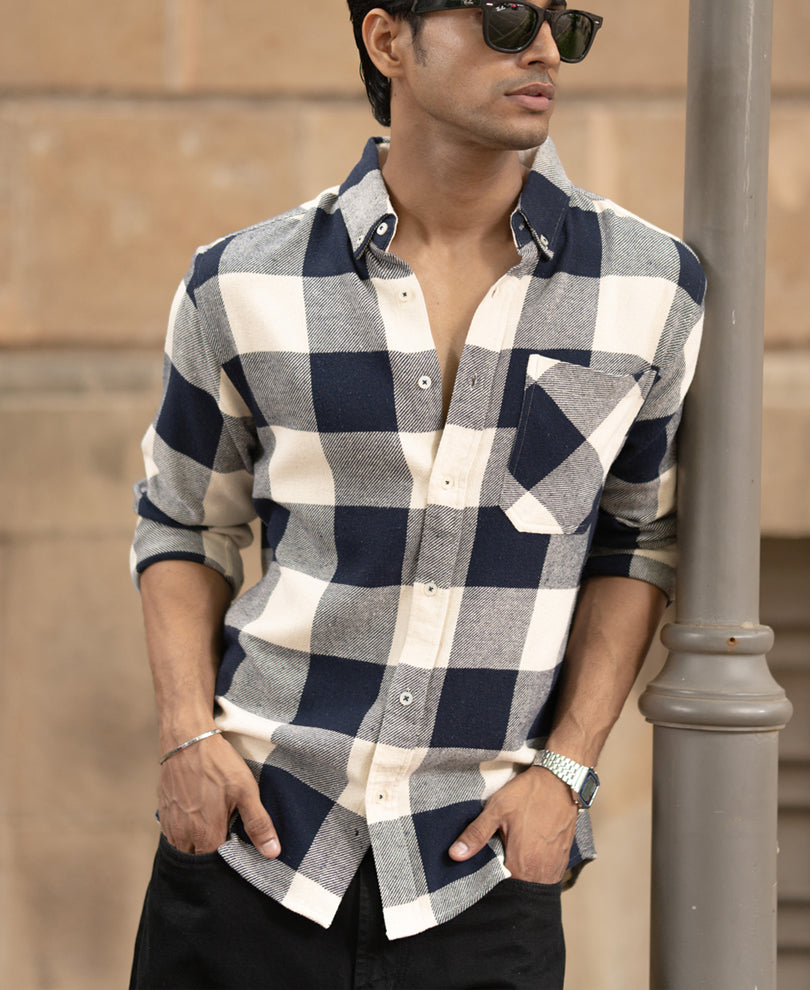 This navy checkered shirt is the no-brainer essential. A single chest pocket, everyday fit, and all-weather fabric perfect for layering or solo fits. Slightly preppy, fully Powerlook.