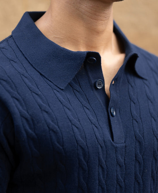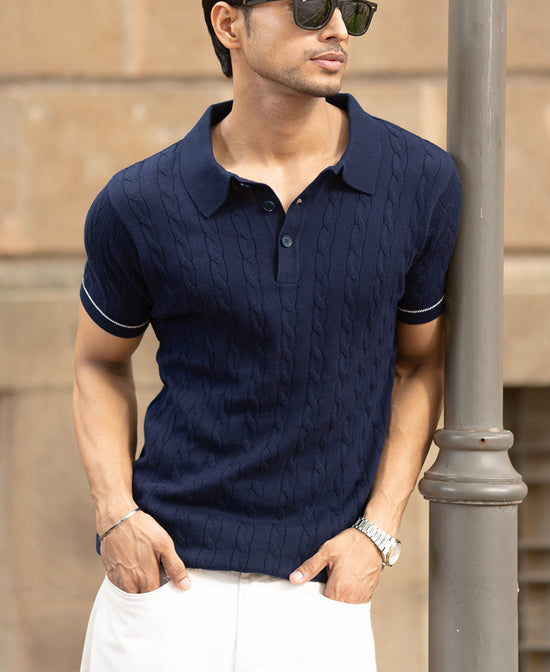 Magnetic, Majestic and all the boxes ticked! Tailored for twilight strolls and sunlit brunches alike, this Navy Knitted Polo T-Shirt is a melody of classic charm and subtle distinction. The cable-knit texture offers a quiet elegance, while the crisp collar and button placket nod to timeless formality. Finished with contrast tipping on the cuffs and hem, it’s where classiness meets a casual tale