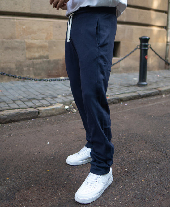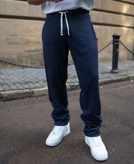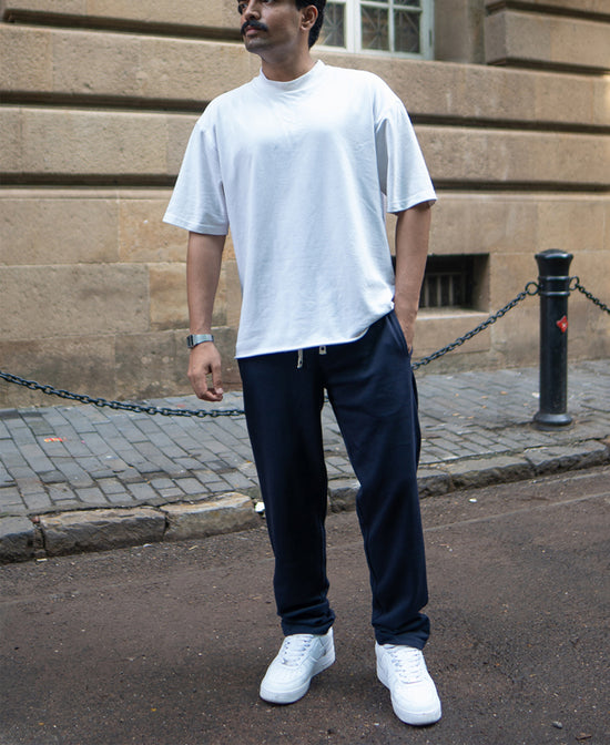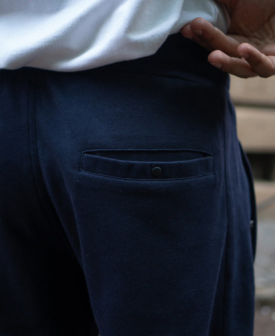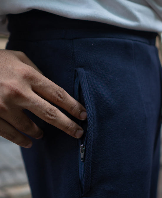 When your joggers feel like Sunday but look like Friday casuals. These navy knitted track pants come in a comfort-first fabric with a clean silhouette that makes lounging look like a style choice. Featuring a drawstring waist, tapered legs, and a back pocket; for those who still believe in fashion with functionality.