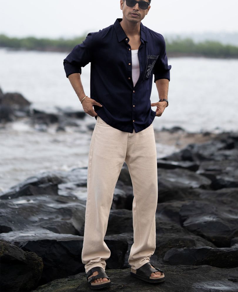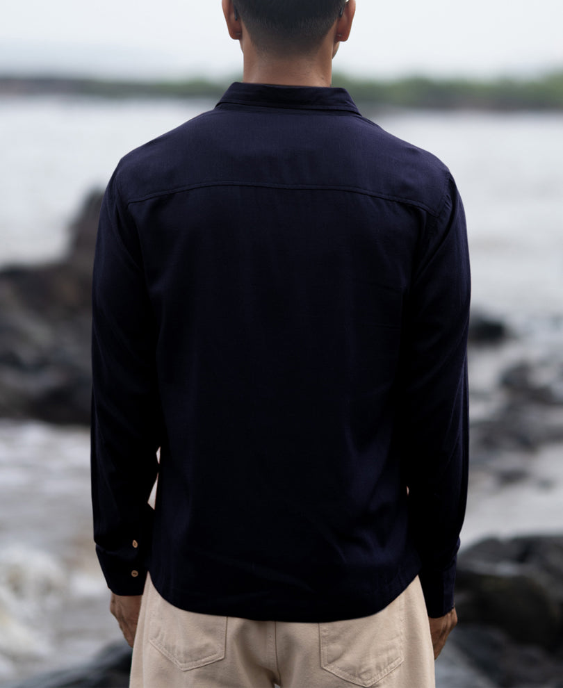 Minimalist with a touch of craftsmanship. This navy linen-blend shirt features subtle embroidery that adds texture without overstatement. Lightweight and breathable, it’s a refined choice for those who value detail, comfort, and understated style.