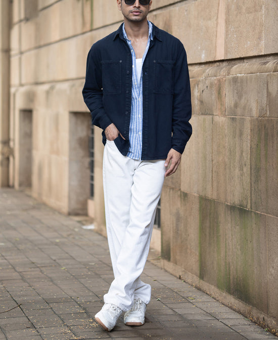 The definition of quiet cool. This navy overdyed overshirt combines utility-inspired design with rich texture. The heavy twill weave makes it perfect as a standalone piece or a lightweight layer for off-duty sophistication. No matter the occasion, this one just fits you in like a liquid movement.