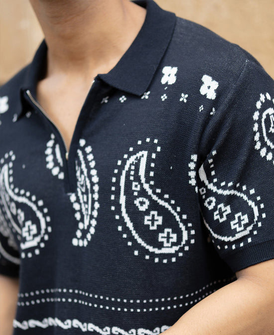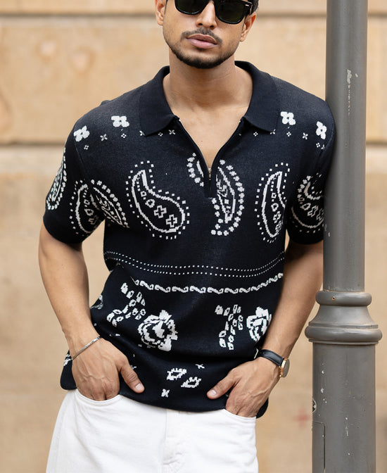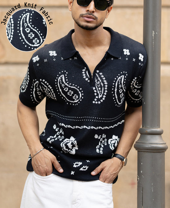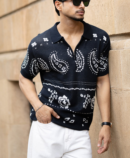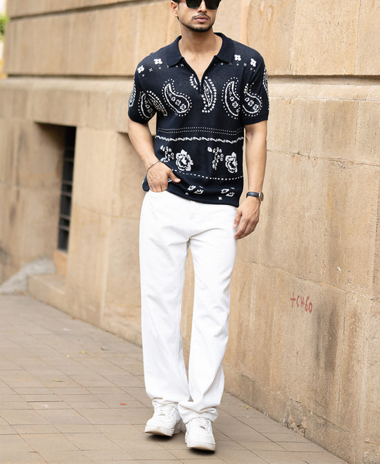 Texture is the hero here. A navy knit base detailed with jacquard paisley motifs brings a luxurious, almost sweater-like depth to this tee. It’s bold without being loud, and different without trying too hard. Best worn with dark denims or neutral trousers when you want to show off your taste.