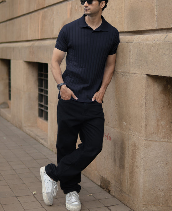 Think dark, deep, and undeniably smooth. This Navy Self Stripe T-Shirt channels rich hues and textured tactility, giving you that well-dressed look without any extra effort. Ribbed to perfection and tailored for a comfortable fit, it’s your quiet flex for everything from date nights to downtime.