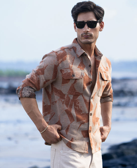 Rich ochre tones with rarely seen intricate jacquard texture. This combo was designed to level up your layering game when you put it on your body. Warm, structured, and statement-making, this overshirt looks like autumn wrapped into fabric. Wear it with denim or neutrals for peak earthy swagger.