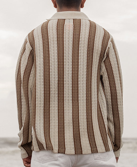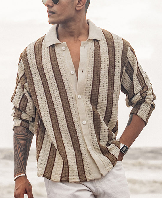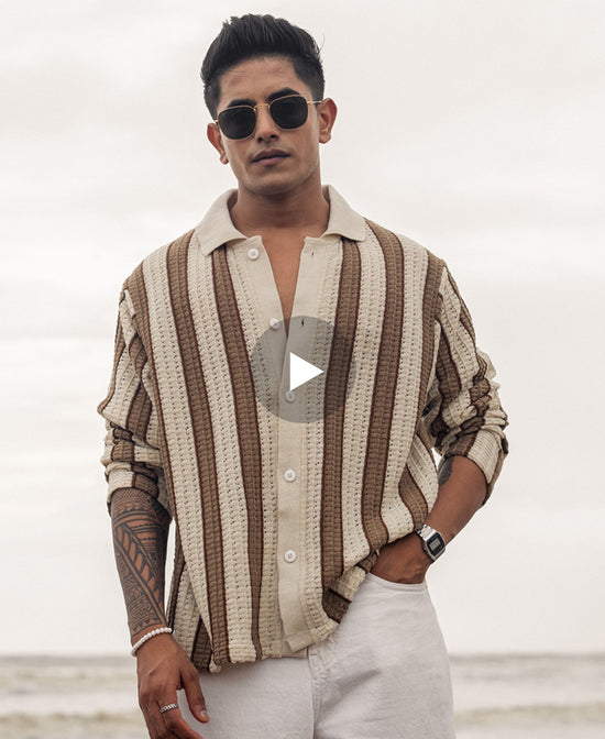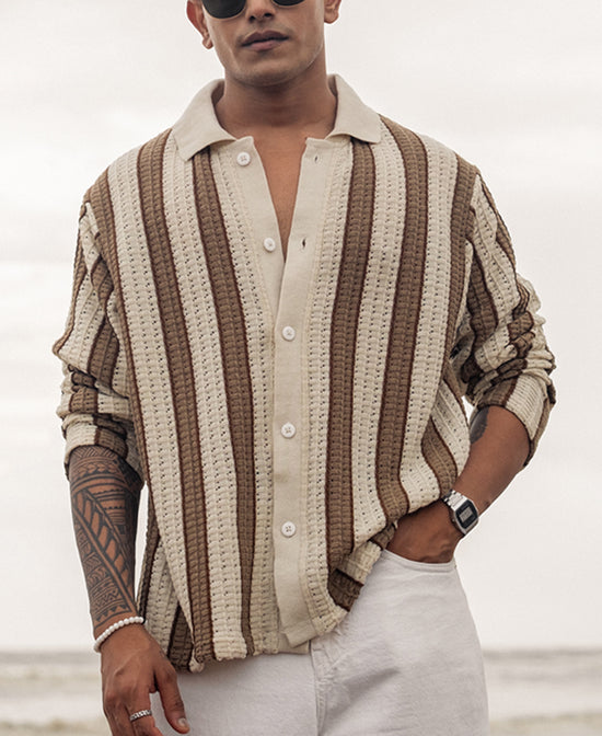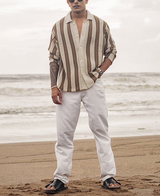 This shirt marries the timeless appeal of stripes with the intricate texture of crochet, creating a look that's both laid-back and sophisticated. The soft, neutral tones of off-white and beige make it a versatile piece that can be dressed up or down, perfect for any casual occasion.