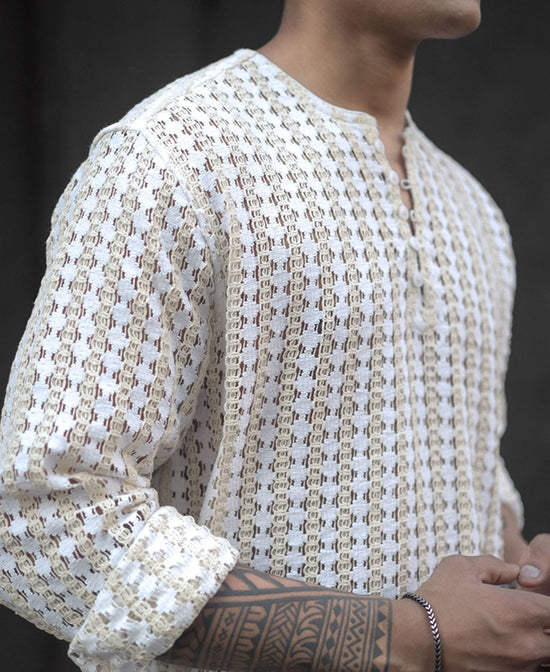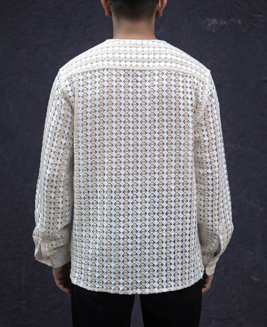 A definitely must-have for everyone who wants to add a little dash of Indian plus fashion to their wardrobe. Made from Crochet fabric this off-white see-through design kurta-style shirt is a combination of stylish and ethnic. It’s comfortable, elegant, and versatile for your on-the-go lifestyle.