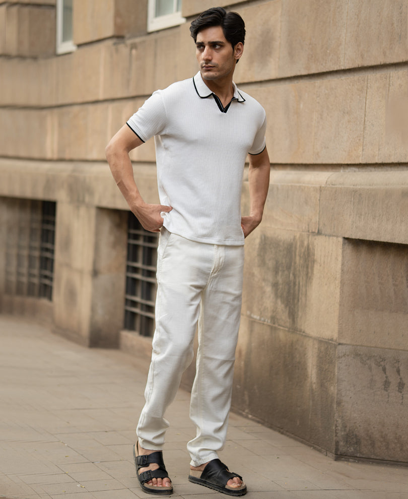 Clean and put together, that’s the quiet appeal of this Polo T-Shirt. The soft off-white base keeps the look minimal and refined, while the dark contrast tipping on the collar and sleeve edges adds just enough definition to break the monotony. Crafted in a breathable knit with a comfortable fit, it holds structure without feeling stiff. There’s a subtle sharpness to it. Get this polo when you want simplicity with a clear edge.