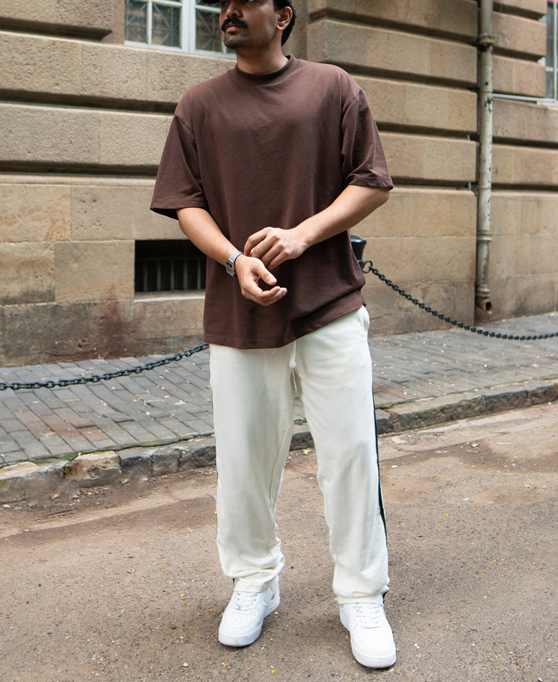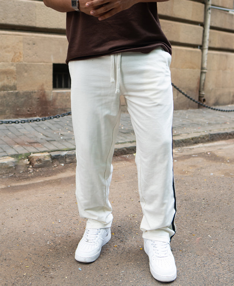 Athleisure gets a sharp upgrade from casual. These off-white track pants with bold contrast taping down the sides bring both function and flair. Whether you're running weekend errands or chilling curbside, they're made to move and made to be noticed.