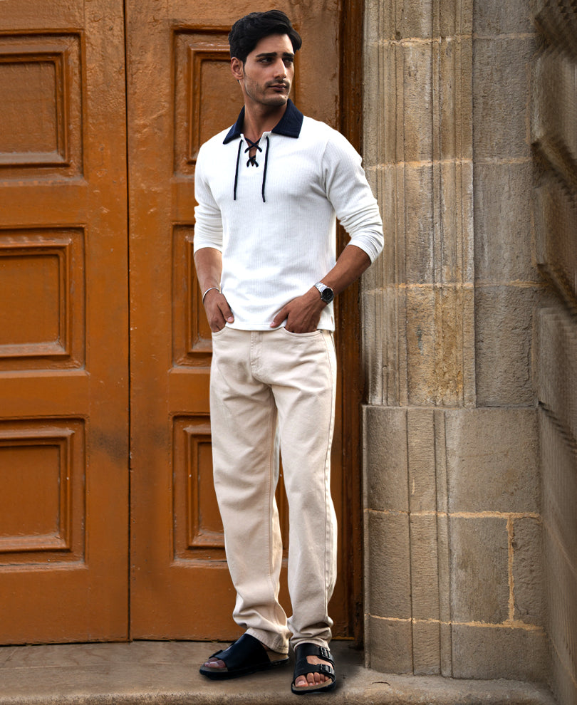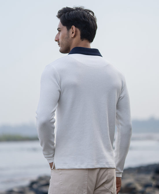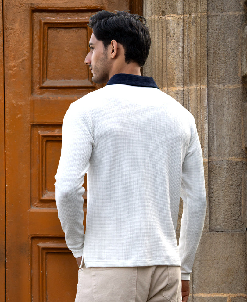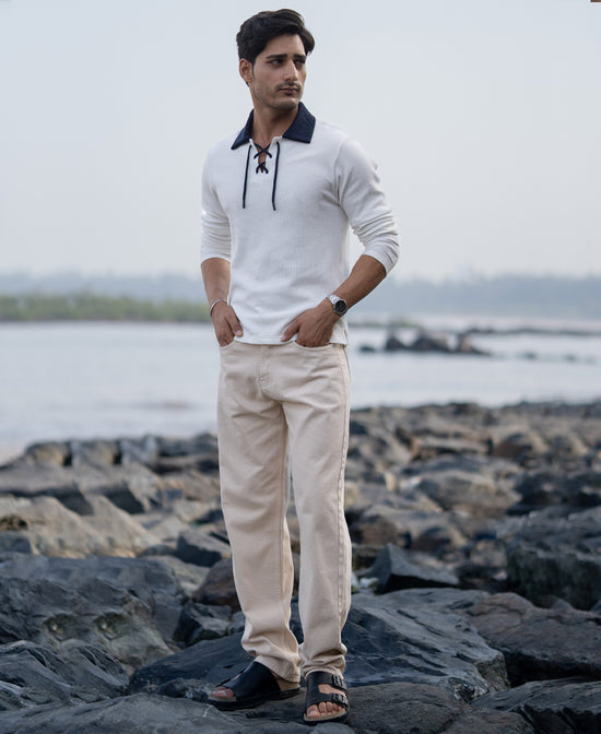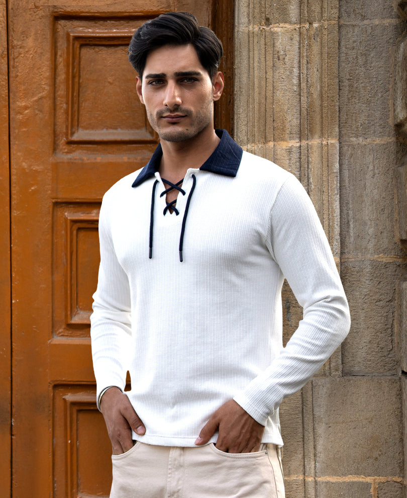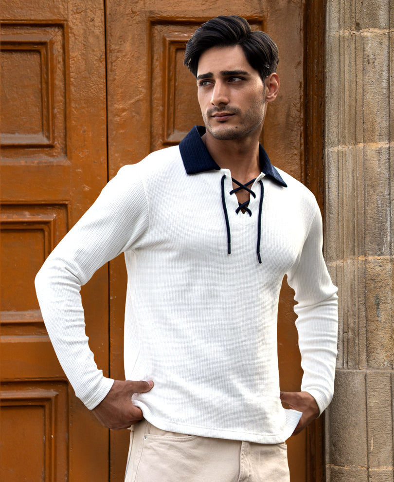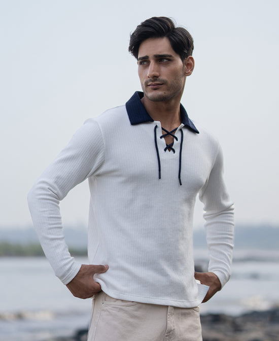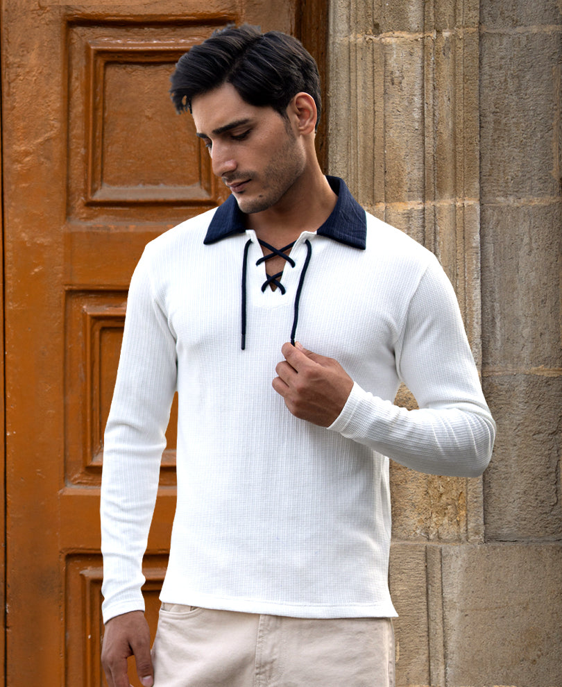 Crafted from a lightly textured fabric, this off-white polo stands out with its lace-up drawstring neckline and contrast collar. Effortless, versatile, and subtly sporty