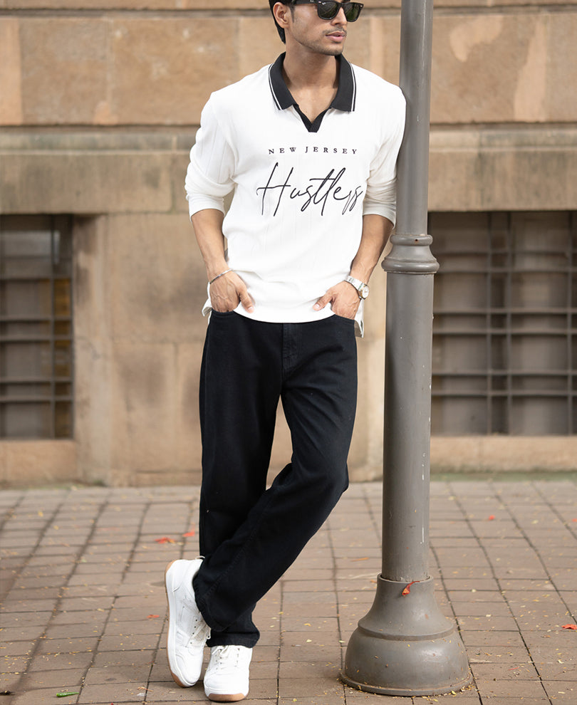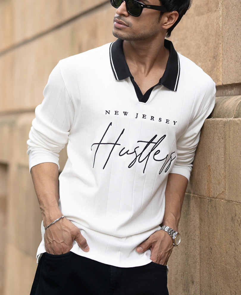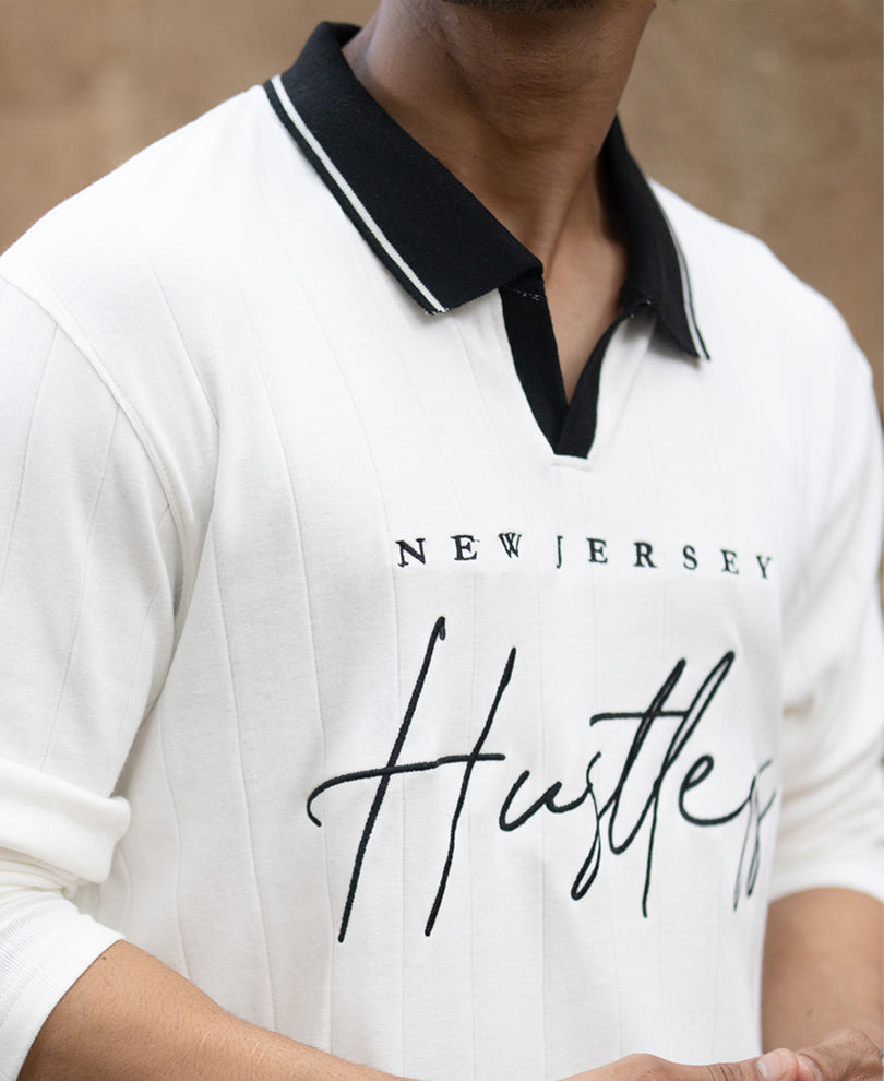 A classic off-white knit with a statement edge. The embroidered Hustler detail makes this tee more than just a basic. Its textured fabric feels luxe, while the subtle design keeps it versatile. For days when you want your outfit to do the talking.