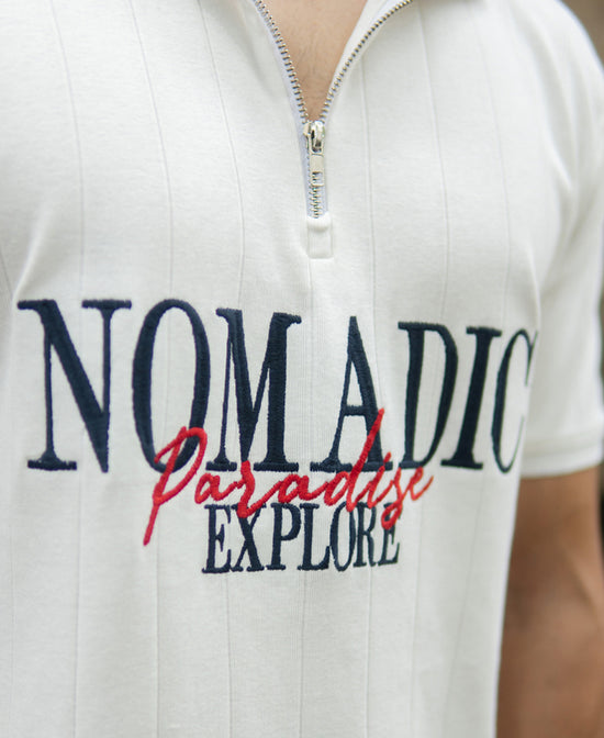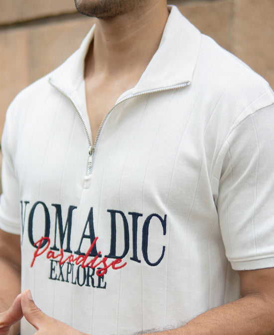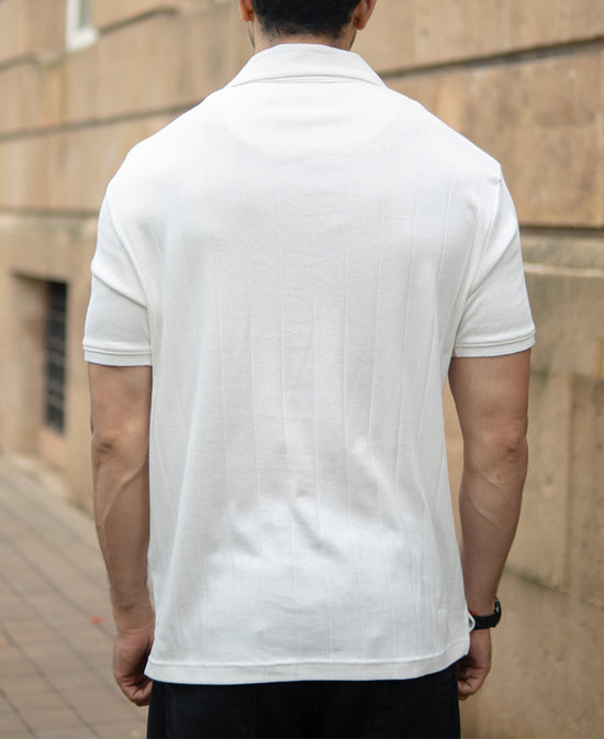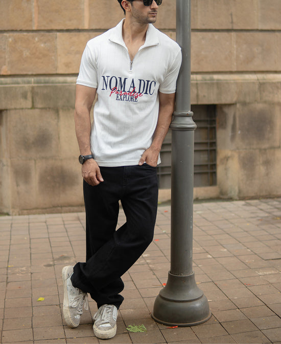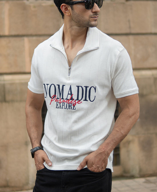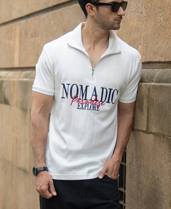 Sporty yet refined, this Off White Embroidered Zipper Polo T-Shirt is designed to keep your style fresh. Featuring bold embroidery on the front and a trendy half-zip neckline, it blends comfort with contemporary appeal. Made from breathable cotton blend, it’s perfect for casual wear with jeans or joggers.