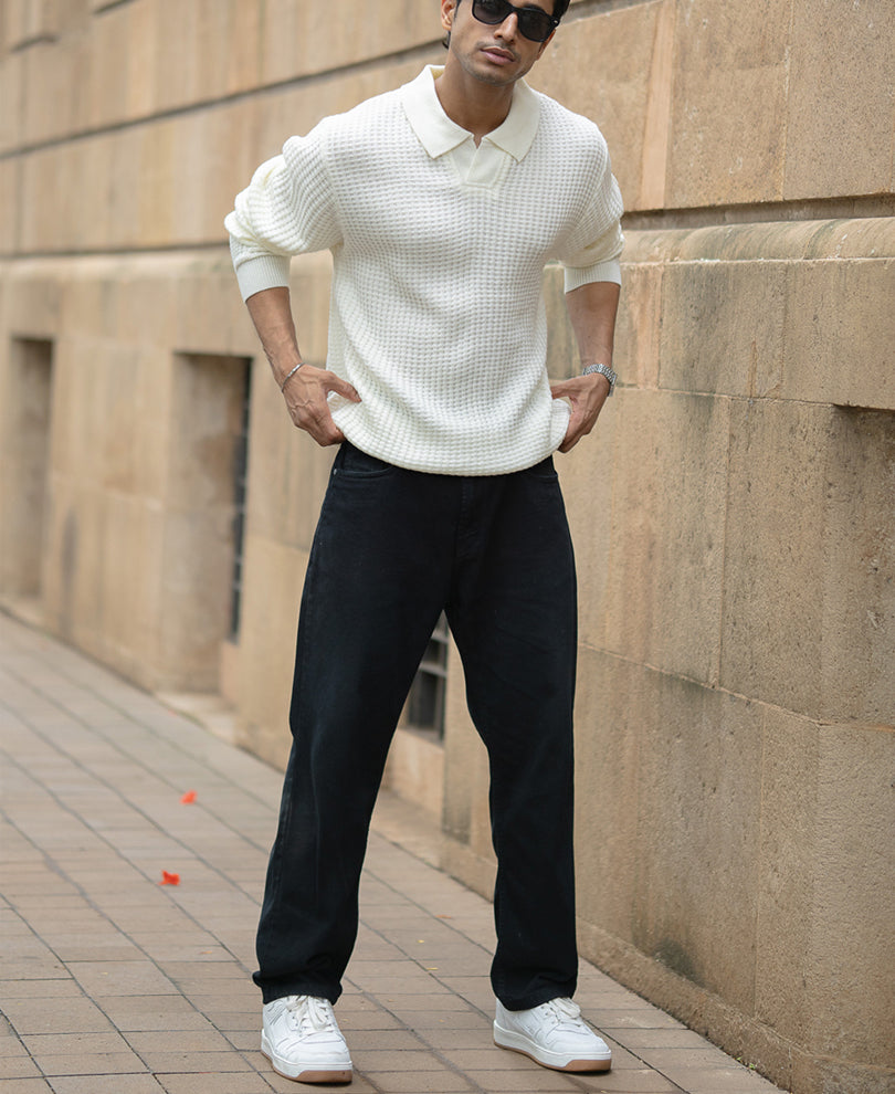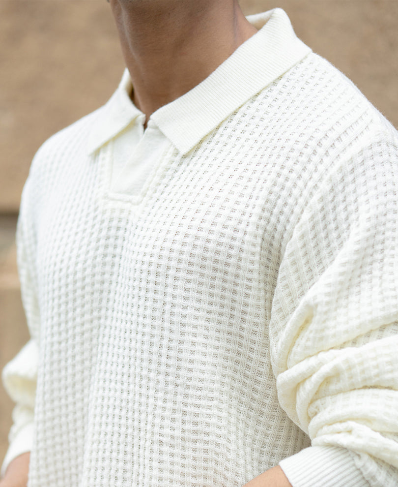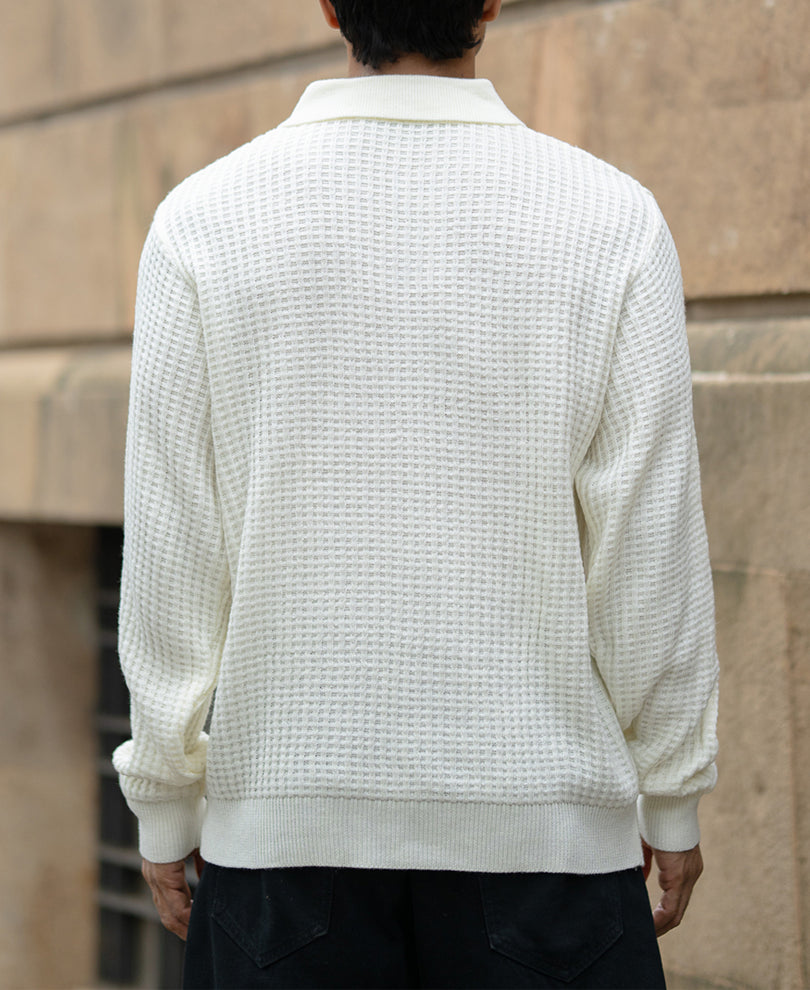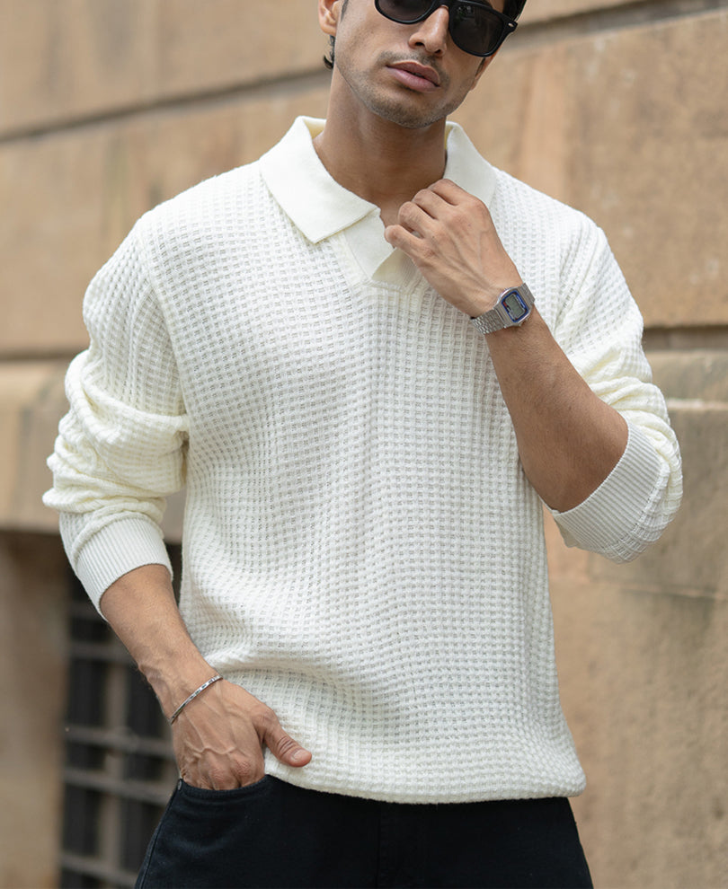 A sweater that speaks sophistication in a whisper. The off-white hue, polo neckline, and fine-knit detailing come together for a clean, timeless silhouette. Light enough to layer, refined enough to wear solo; it’s elegance wrapped in warmth.