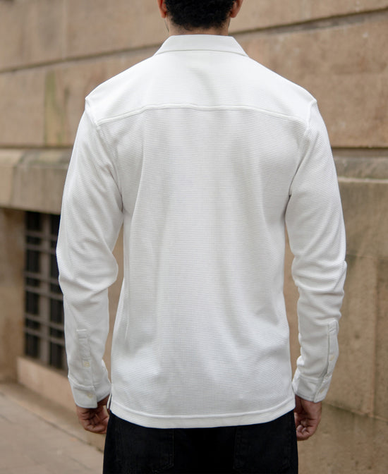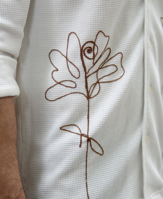A piece that blurs the line between art and apparel. This off-white knitted shirt features delicate line embroidery that adds a soft, hand-drawn charm to your look. With its breathable knit texture and relaxed silhouette, it’s one of those shirts that speak quietly but leave a lasting impression. Perfect for evenings where style meets subtlety.