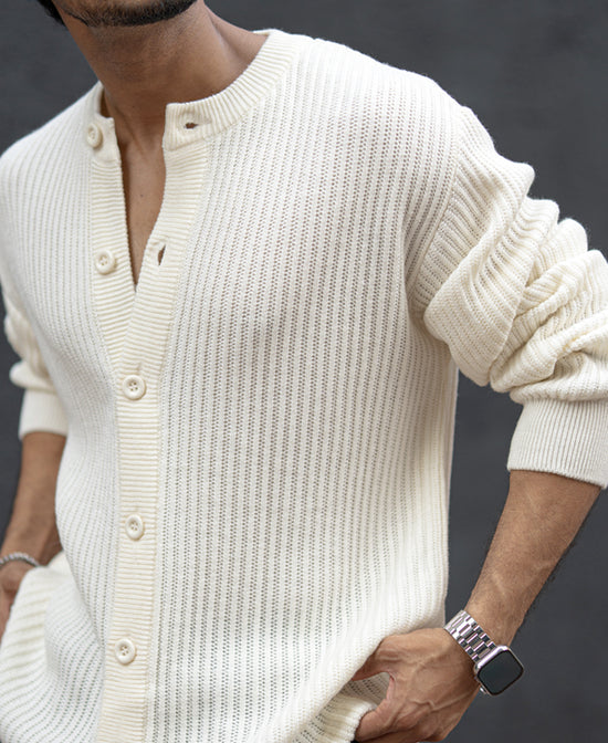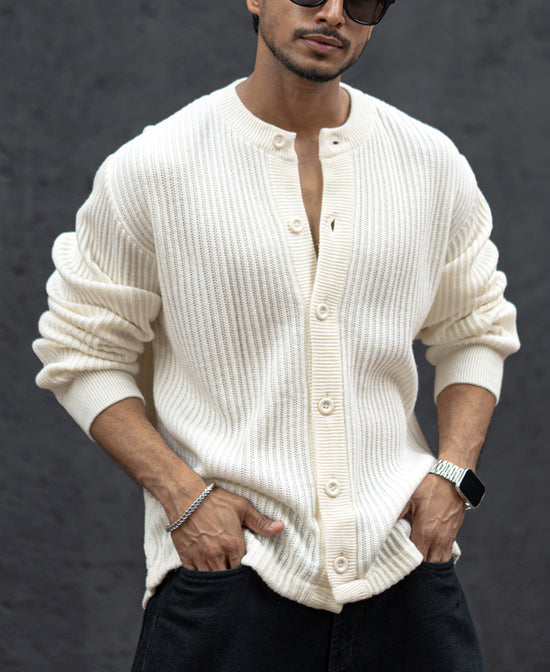 When staying warm meets effortless edge. This off-white sweater jacket wraps you in soft, breathable warmth with a full-sleeve design that’s perfect for chilly mornings or late-night plans. The clean silhouette and regular fit make it a versatile layer, blending comfort and understated style with ease.
