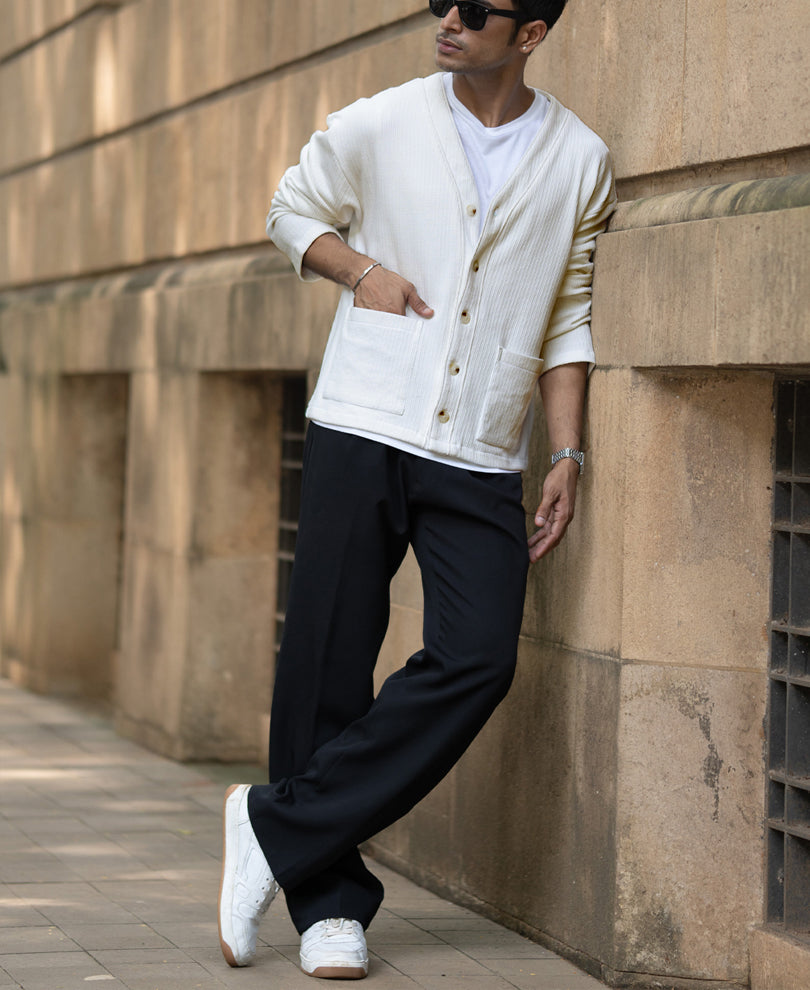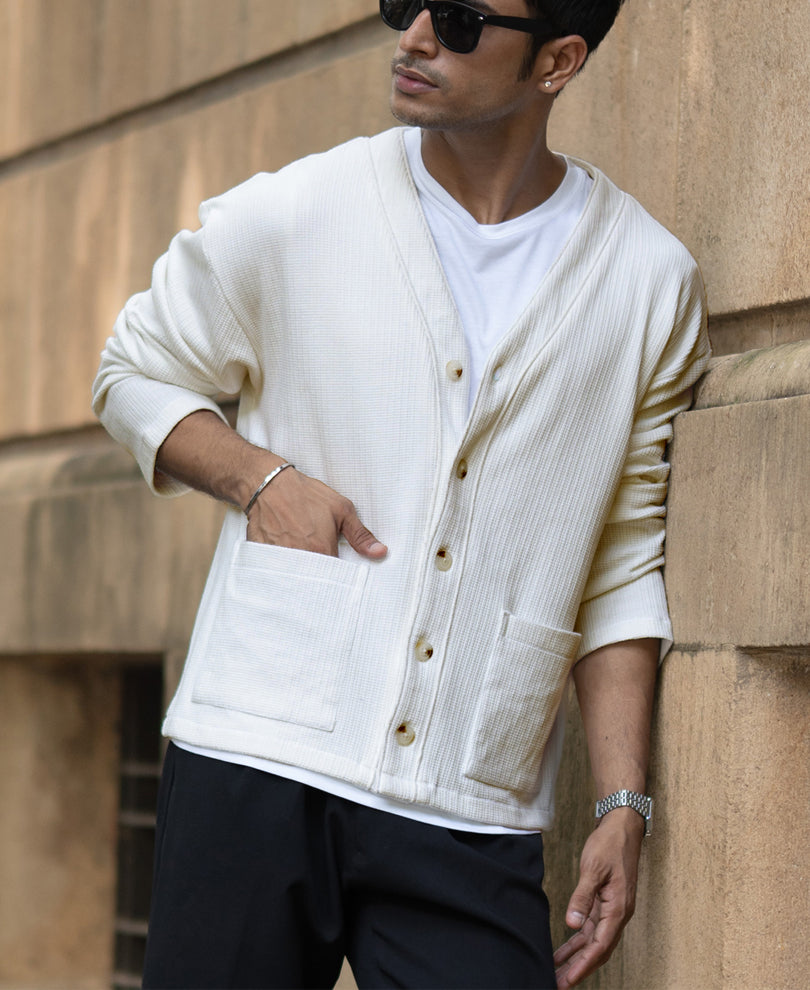Soft sophistication at its best. This off-white knit cardigan blends comfort and class with its structured texture and minimal silhouette. Perfect for breezy evenings or layering over a crisp shirt when you want subtle style and ease your presence.