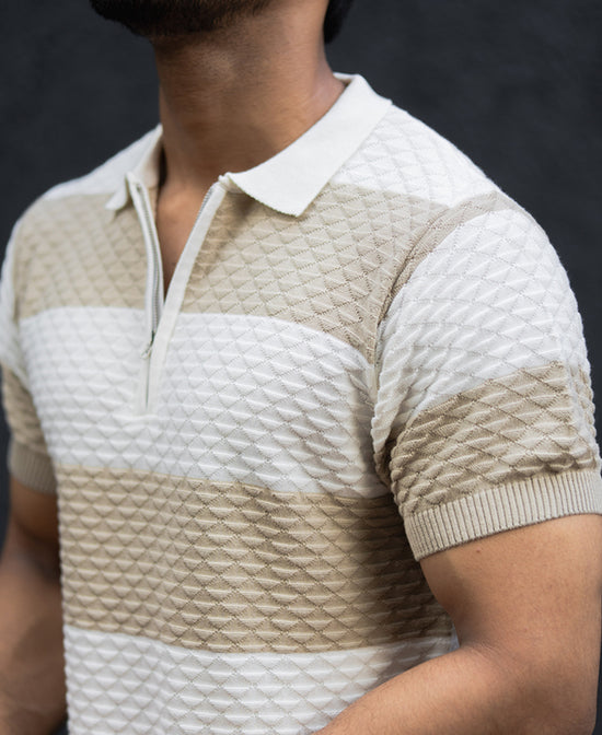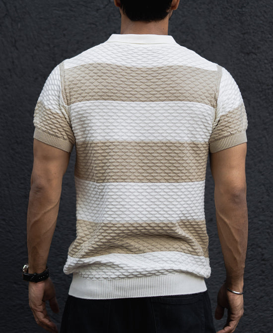 This Off White Structured Striped Half-Sleeve T-Shirt can jazz up your casual wardrobe. It's perfect for casual get-togethers and weekend excursions because of its regular fit and polo neck. For a polished look, pair with jeans, chinos or shorts.