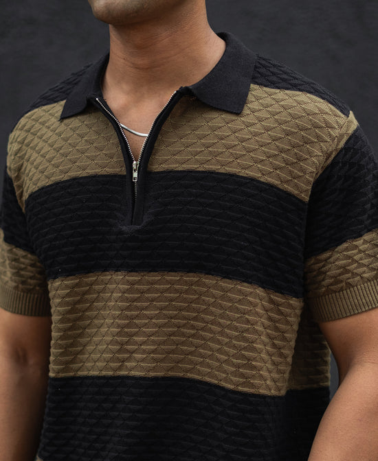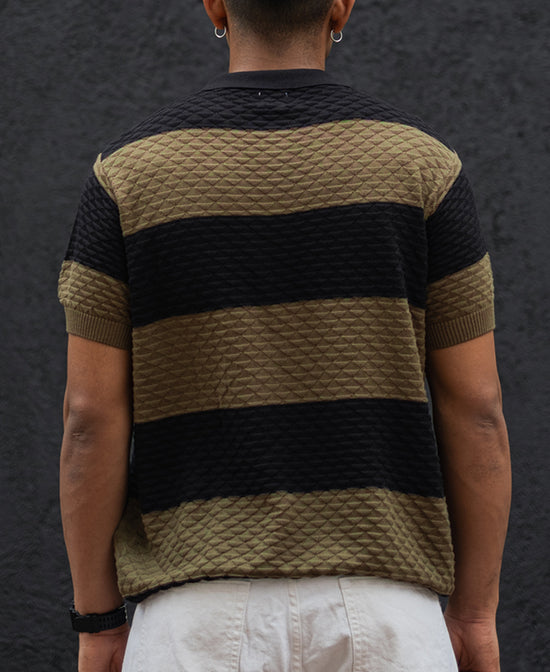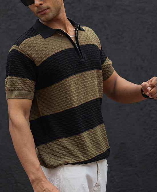 If comfort is your priority but style isn’t something you’re willing to compromise on, this Olive Green and Black Structured Striped Regular Half Sleeves T-Shirt is here for you. Crafted from 100% cotton, this half-sleeve t-shirt combines breathability with a sleek design. The unique olive green and black stripes will have you standing out without even trying. It's the kind of t-shirt you wear when you know you’ve got things covered.