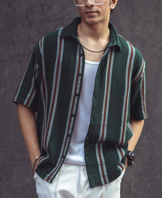 Olive green vertical stripes oversized shirts for men with spread collar, drop shoulders, half sleeves, and textured finish. Made from a blend of Structured fabric, the oversized shirt offers unparalleled comfort and style. It is a versatile piece that gives you an edge at the office and off duty. Pair it with baggy jeans or trousers on weekends and holidays.