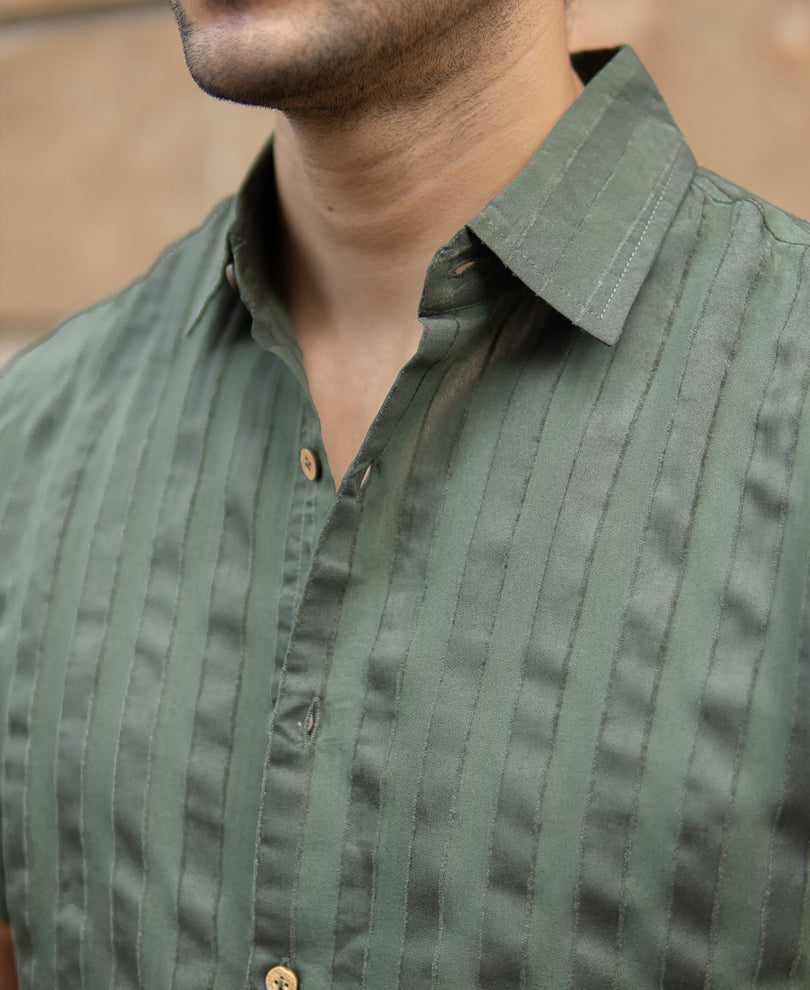 For the modern naturalist. The Olive Structured Self Striped Shirt embraces earthy tones with architectural lines. Wooden buttons and the forest hue make it feel grounded, while the structure keeps it sharp. Best worn when you want to show up subtle, but still look like you planned the whole fit.