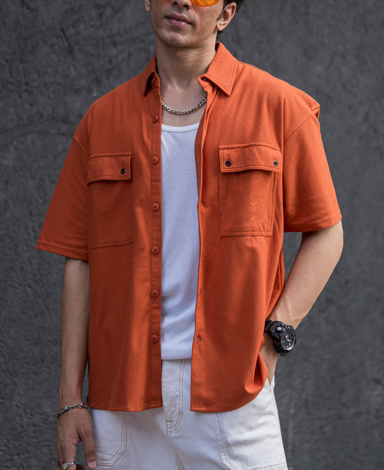 Orange oversized shirts for men with a spread collar, flap pockets, drop shoulders, and textured finish. With its color pop-up, the oversized shirt adds freshness to any outfit. It is made from a Blend of Cotton Knitted fabric that offers superior comfort and durability. Stay on trend by pairing this oversized shirt with light denim jeans.