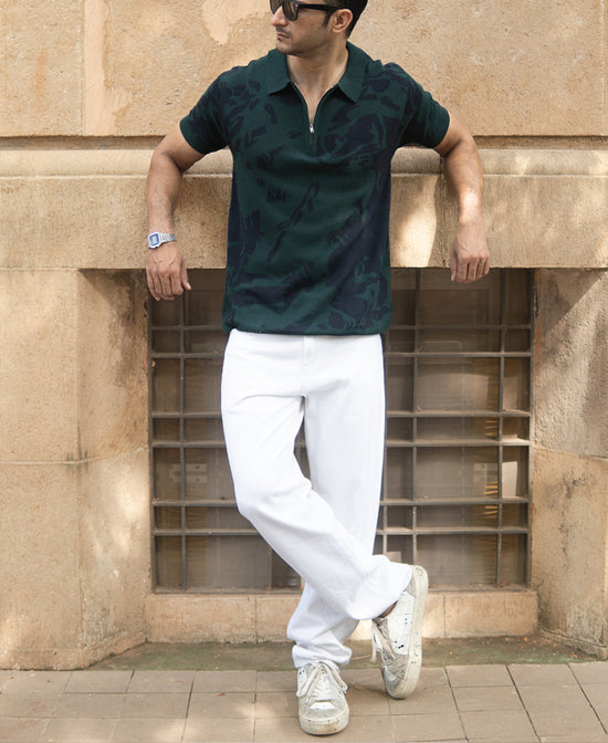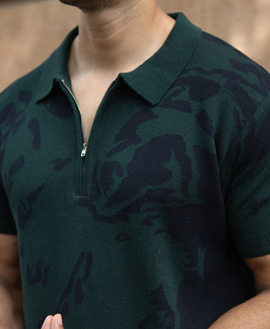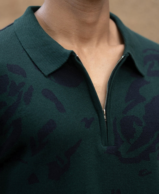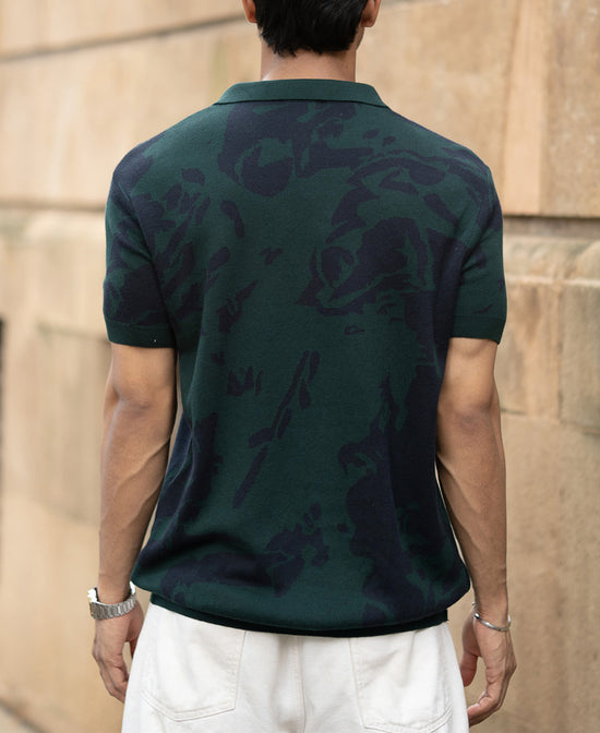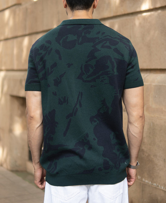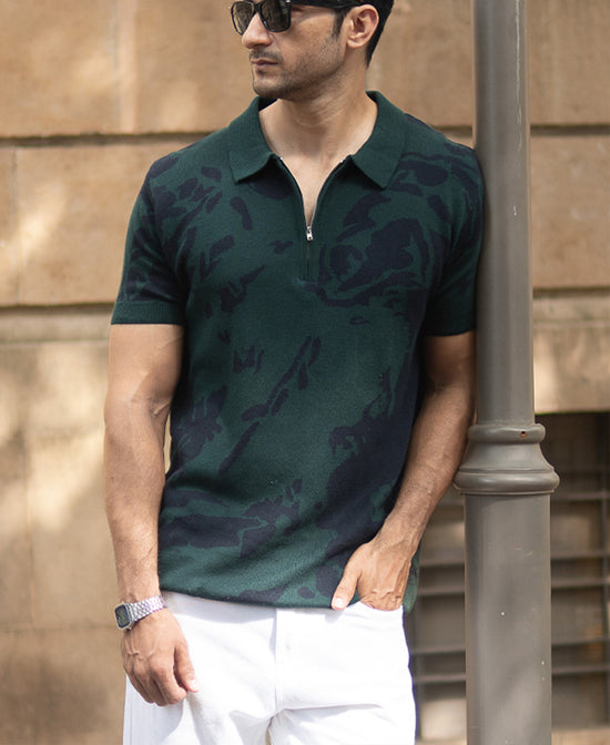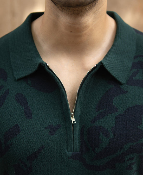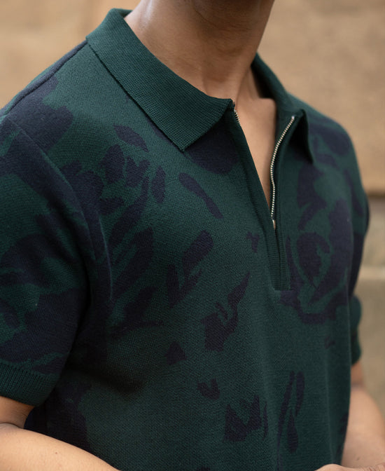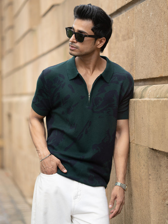 In deep pine green with a shadowy abstract pattern, this knitted polo is built for the ones who like their statements a little subtle. The half-zip and ribbed edges keep it tailored, while the print adds a touch of intrigue up close.
