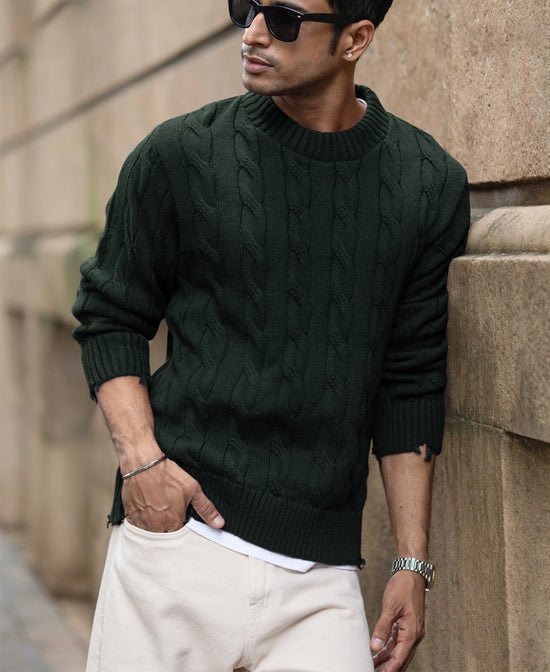 Infused with earthy warmth, this pine green cable knit sweater brings timeless sophistication to modern wardrobes. With its soft handfeel and intricate weave, it’s built for crisp weather and cozy moods alike. A staple you’ll reach for, season after season.